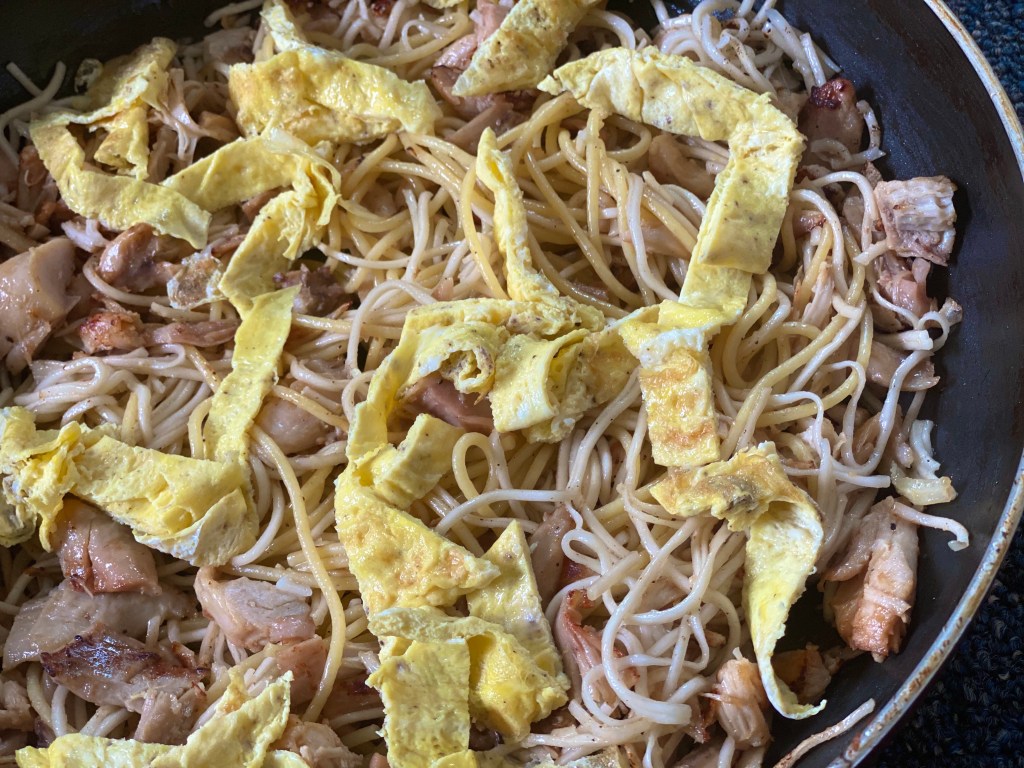 - Add in noodles. Check the seasoning. Stir to combine. Turn the heat off. Serve the noodles with the fried egg strips.