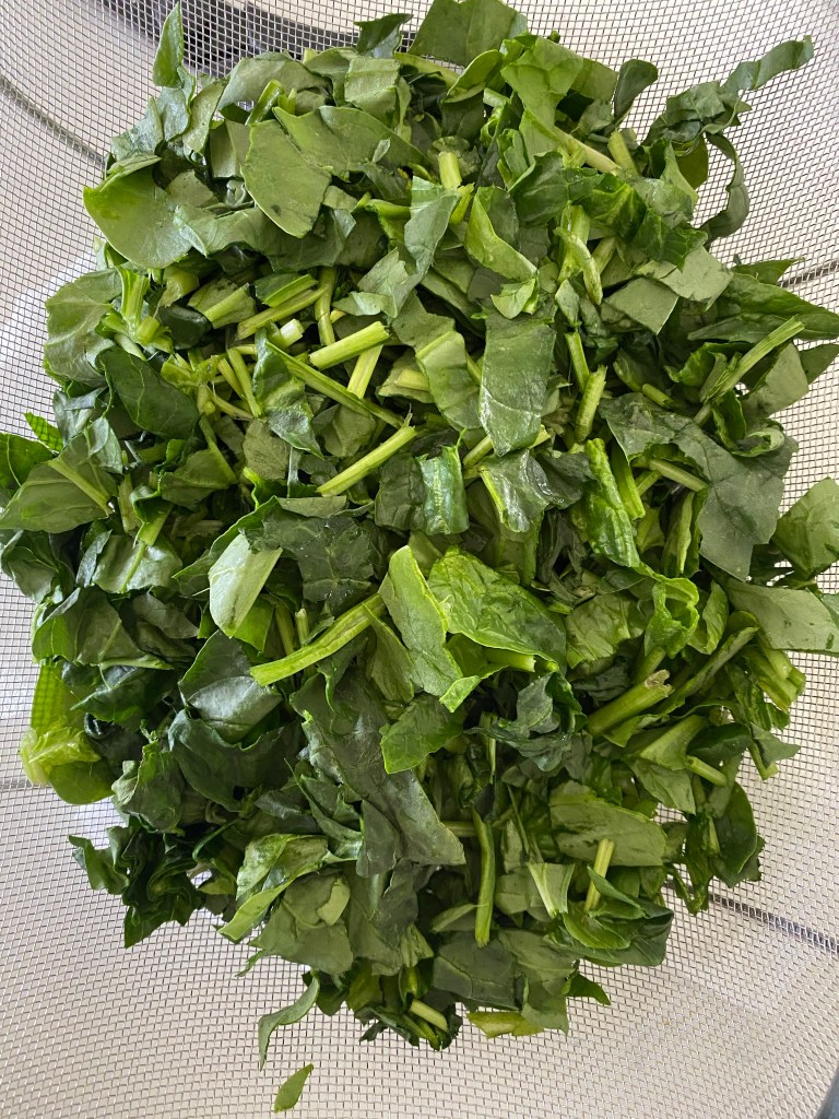 - Chop spinach. Fill up a large pan with cold water. Put chopped spinach in water. Let it stay for 5 mins. Lift into a colander to drain. Discard the water. Repeat this process till the water runs clear of all dirt and grit.