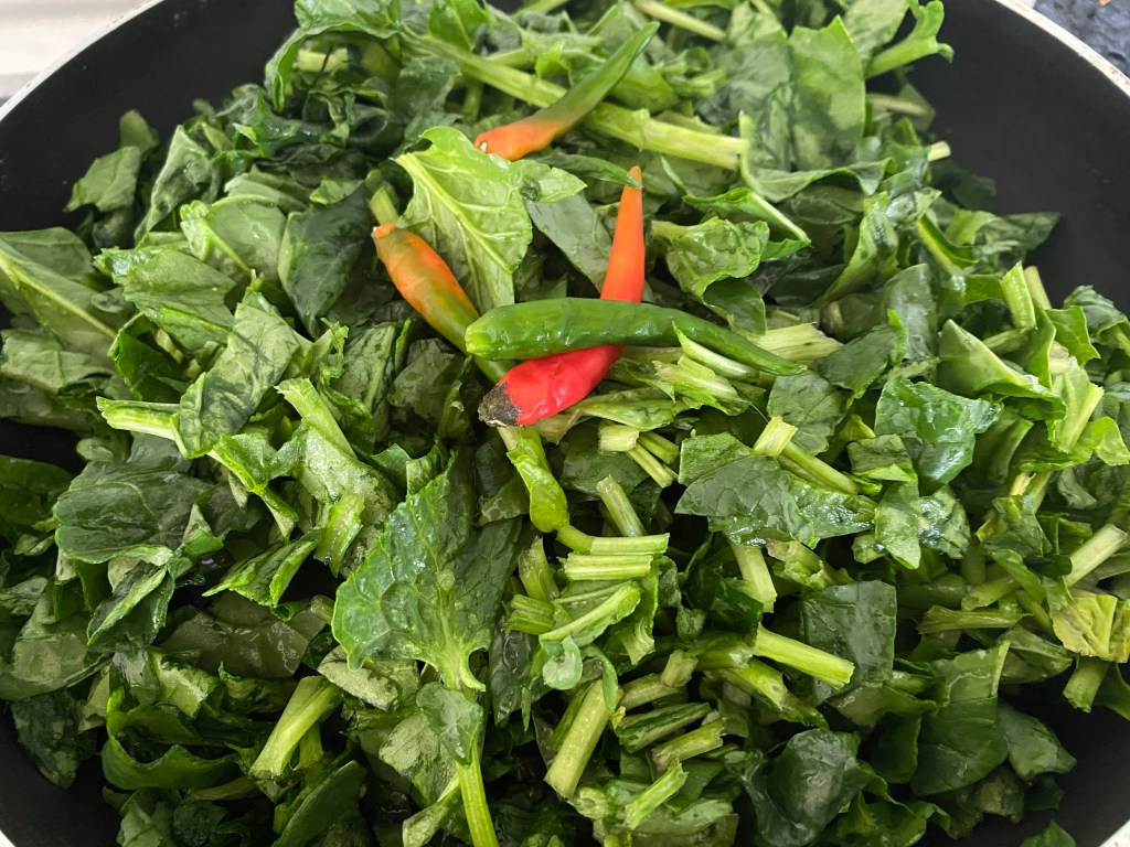 - Put chopped spinach in a pot with 1 cup of water and green chilies. Boil for 10 mins. Turn the heat off. Cool. Grind.