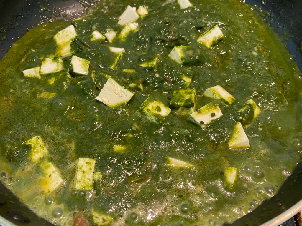 - Add the puréed spinach. Crush kasuri methi in the palm of your hands gently. Add it to the spinach. Add garam masala powder, turmeric, salt, sugar, red chili powder. Add milk. Let it cook gently. Add in the paneer cubes. Mix. Turn the heat off. Drizzle some cream and dollop of butter. Sprinkle some red chili powder. Serve with roti or chapati.