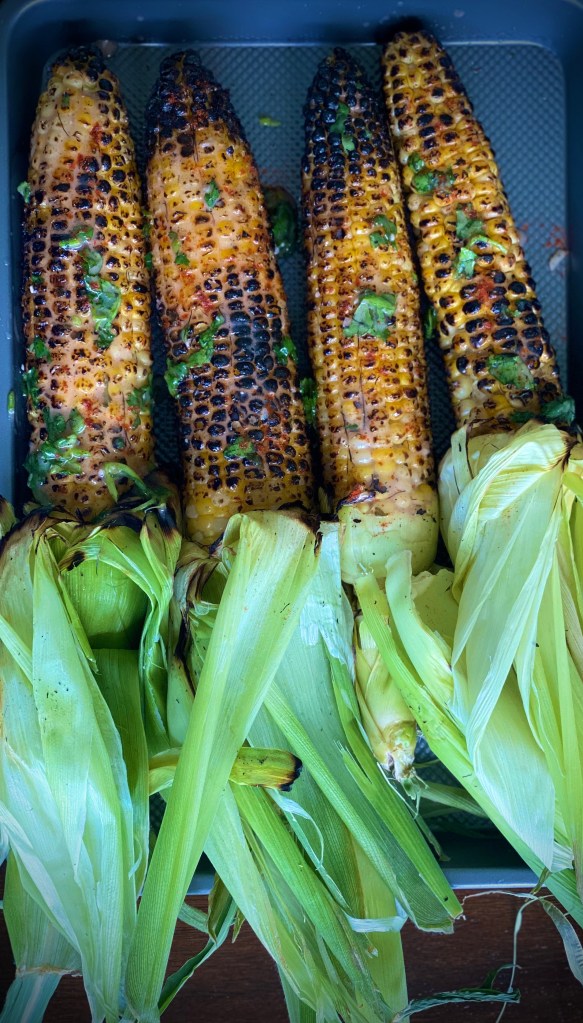 - On the gas cooktop grill the corn on the open fire. Use grill tongs to turn the corn around to ensure it is charred all over. Put on a tray.