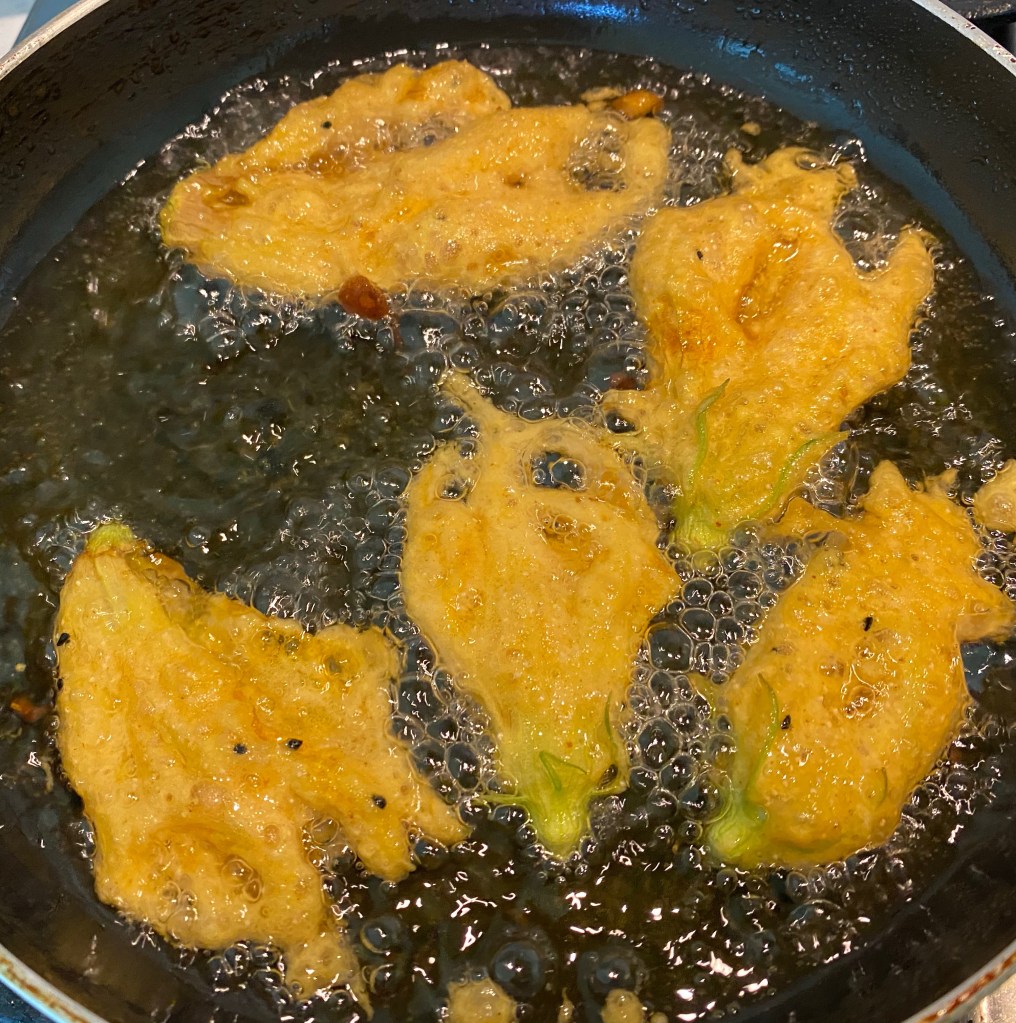 - Heat oil to high. Reduce the flame to medium. Dip each pumpkin blossom into the batter, and gently release into the hot oil. Fry both sides till golden on a medium flame. Drain on kitchen towels. Do not crowd the pan. Fry 4-5 at a time.