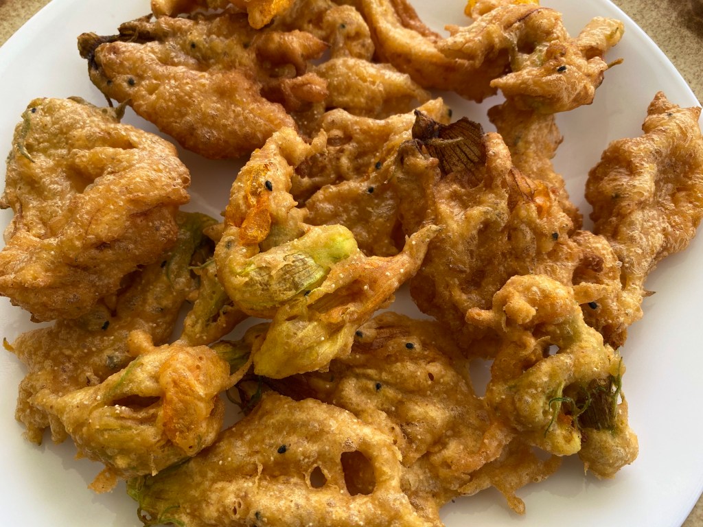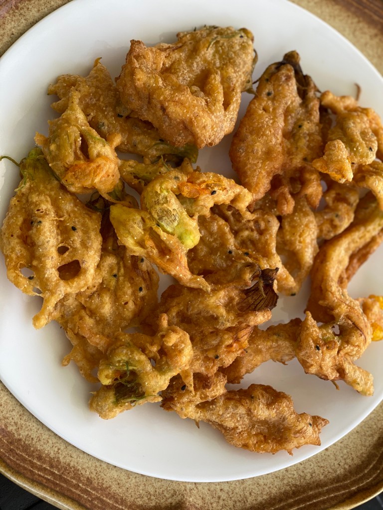My vegetable patch is yielding pretty good pumpkin flowers this year. I do not know if I’ll get any pumpkin just yet, but there is definitely some pumpkin greens and blossoms to harvest. Also, the feeling of just going to my vegetable patch and plucking the flowers to make this dish makes them extra special.