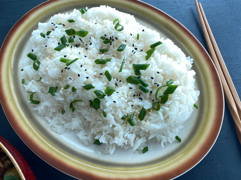 Rinse jasmine rice. Put in the pressure cooker with 1 ½ cups of water. Cook for 1 whistle. Let the pressure release by itself. Serve on a plate. Pour toasted sesame oil on the rice and top with a sprinkle of black sesame seeds, white sesame seeds and chopped green onions. Keep aside.