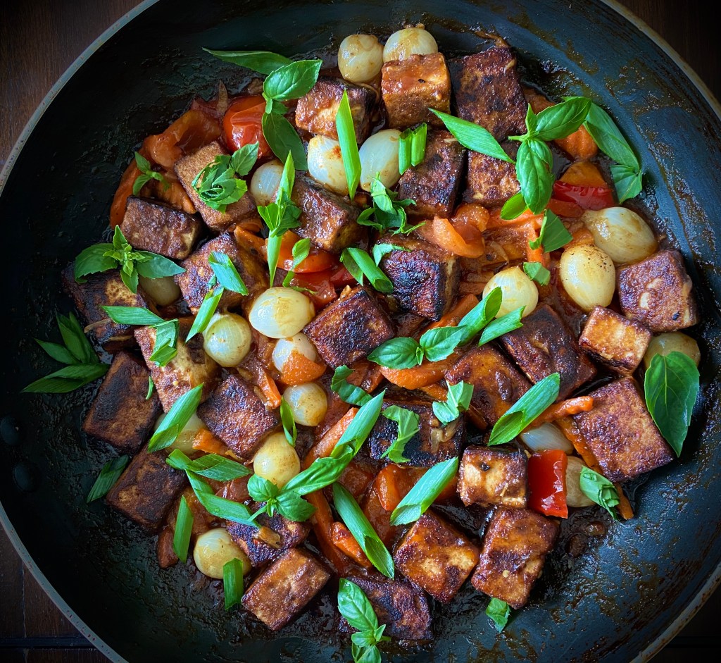 - Pour in homemade bbq sauce. Put in black pepper powder, sriracha and garlic powder. Add in fried tofu. Mix gently. Garnish with chopped green onions and basil.