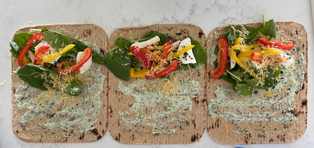 - Spread the sour cream mixture on the wraps. Top with mozzarella, yellow bell pepper, red bell pepper, spinach and grated cheddar.