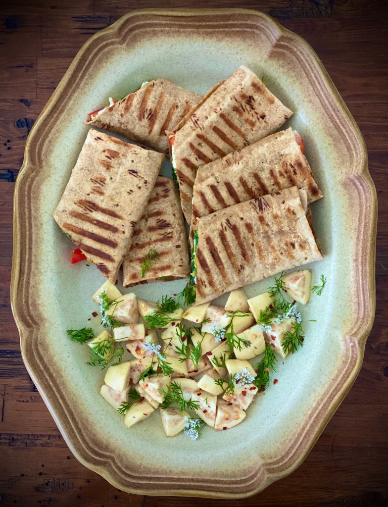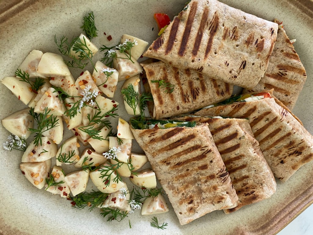 - Roll the wraps tightly and place on the panini press. Brush with olive oil. Cook till the cheese melts. Cut into halves. Serve with tangy guava salad.