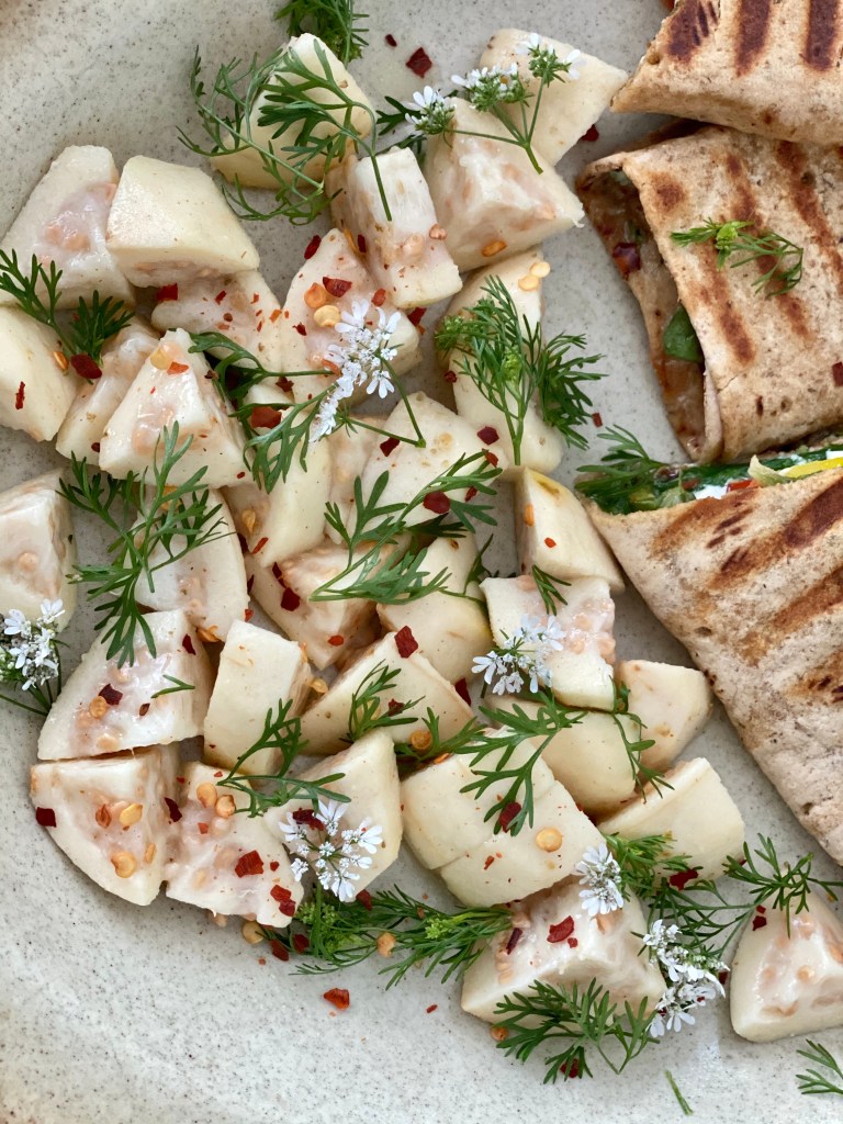 - Sprinkle with red chili flakes, coriander leaves and coriander flowers.