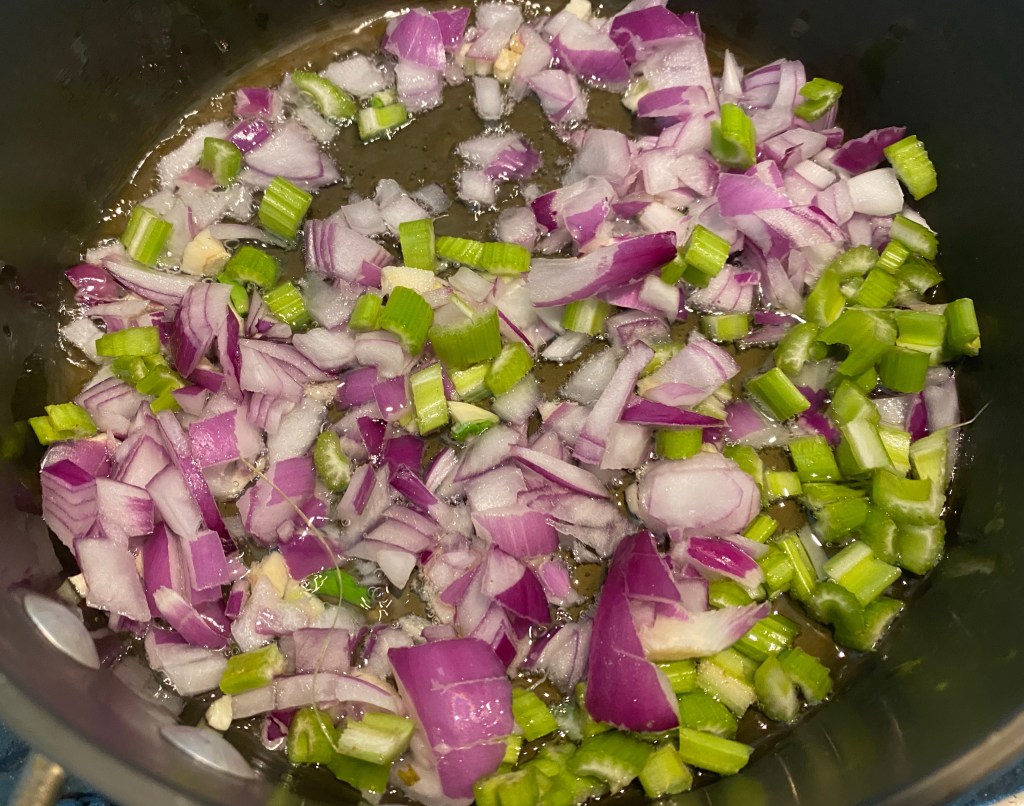 - Heat oil. Sauté onion, garlic and celery. Cook till onion is translucent. Put in boiled vegetables and season with salt and pepper. Cook for a couple of minutes.