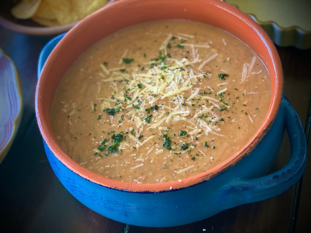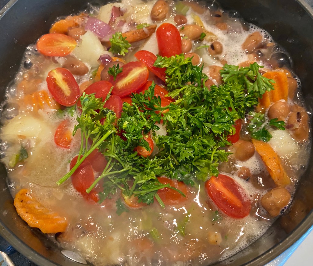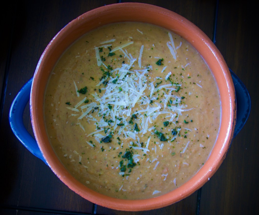 Fava beans can be purchased dry or canned. They are a great source of protein, fiber and nutrients. Usually a bean soup is made with uncooked beans. This is a super easy and quick recipe with canned beans done in less than half the time. I’ve added potatoes, carrots, celery, onions and garlic but any vegetables you have can be added to the mix. The boiled garlic has a creamy consistency when puréed into the soup and gives a mild and sweet flavor to the dish while the sautéd garlic adds that assertive and piquant note. Store bought vegetable stock often used in soups have too much sodium (salt) in it and I find that in itself makes the food unhealthy. Sautéing fresh vegetables and adding seasoning is sufficient in imparting flavor to the soup without compromising in taste @sarchakra