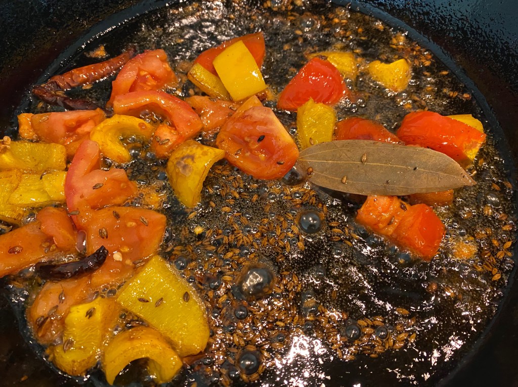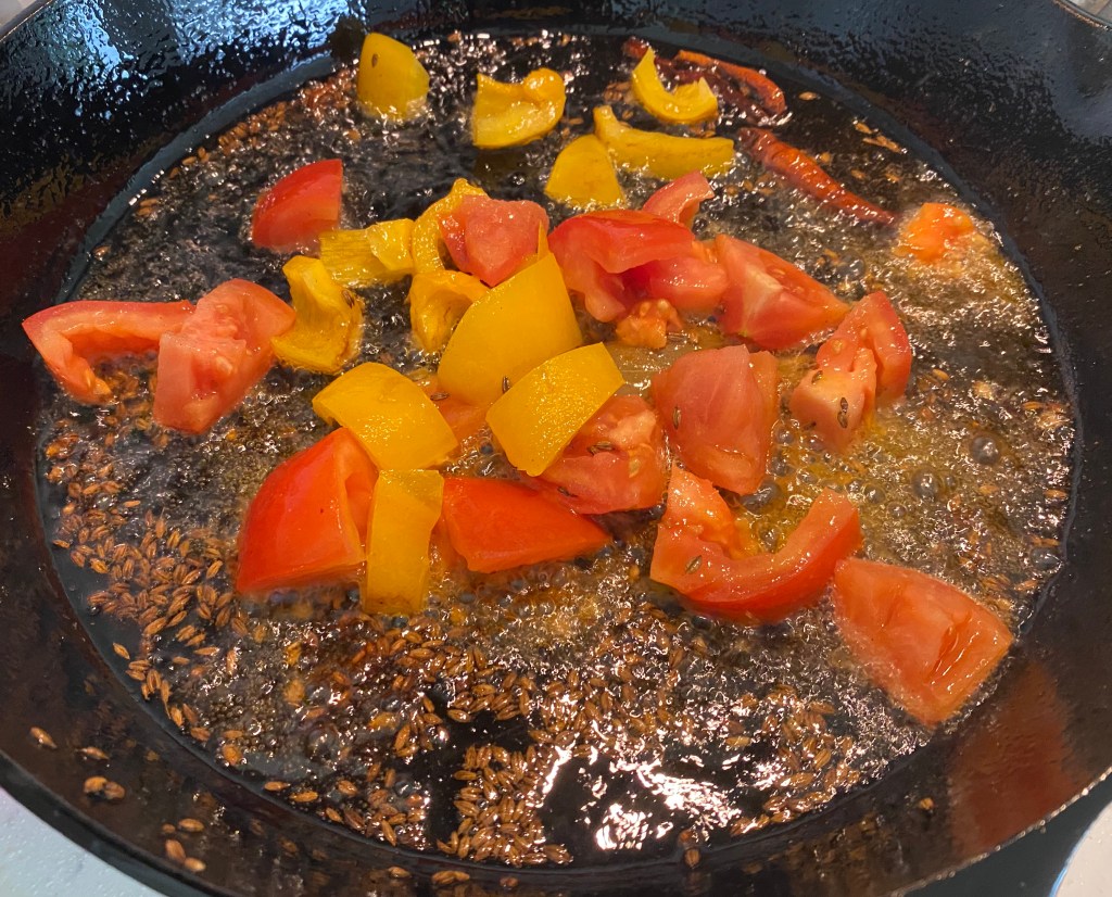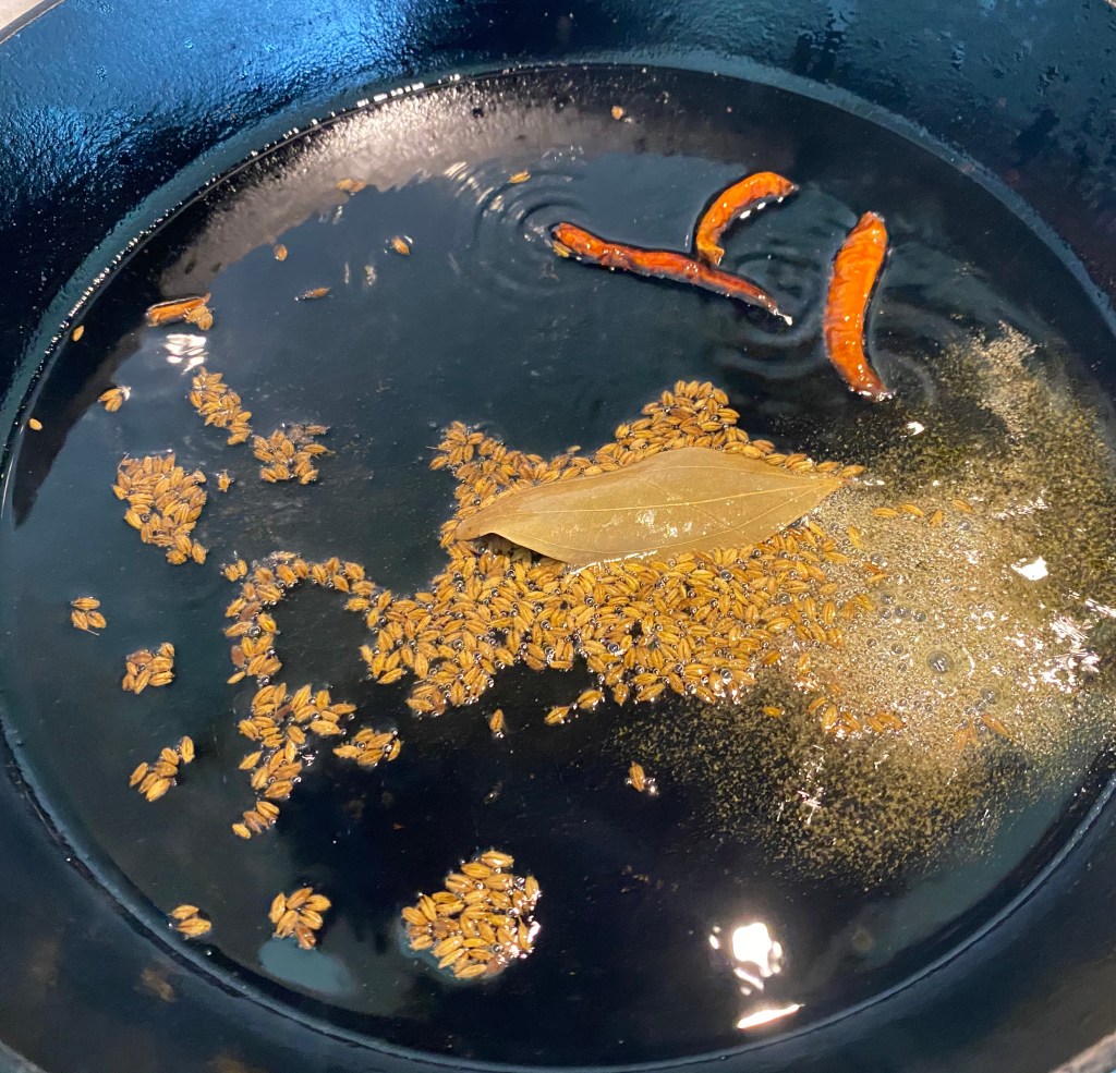 - Heat oil in the cast iron pan. Temper cumin seeds, bay leaf, whole red chilies, asafetida. Let it turn aromatic.