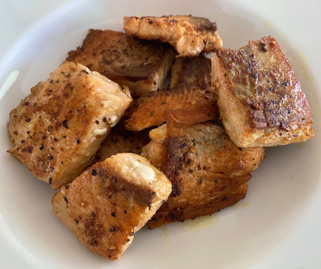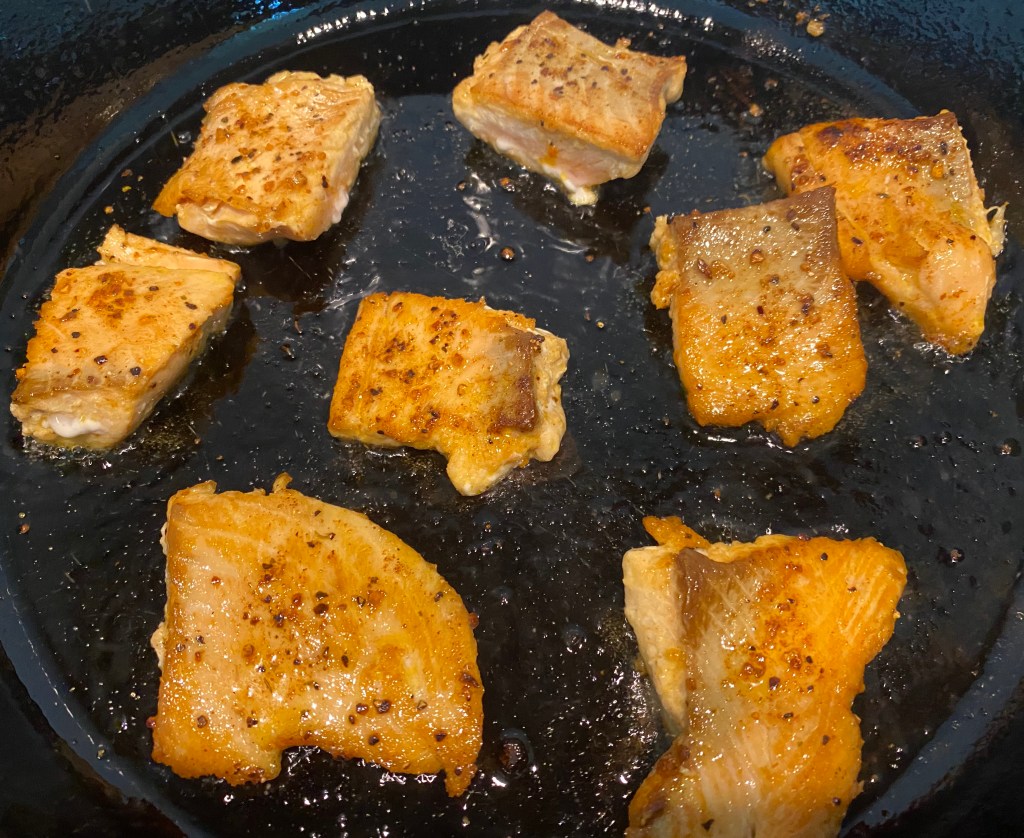 - Heat oil in a cast iron pan. Put in seasoned salmon and let one side cook before turning the other side. That’s it, you’re done. Serve with a salad or just eat as is.