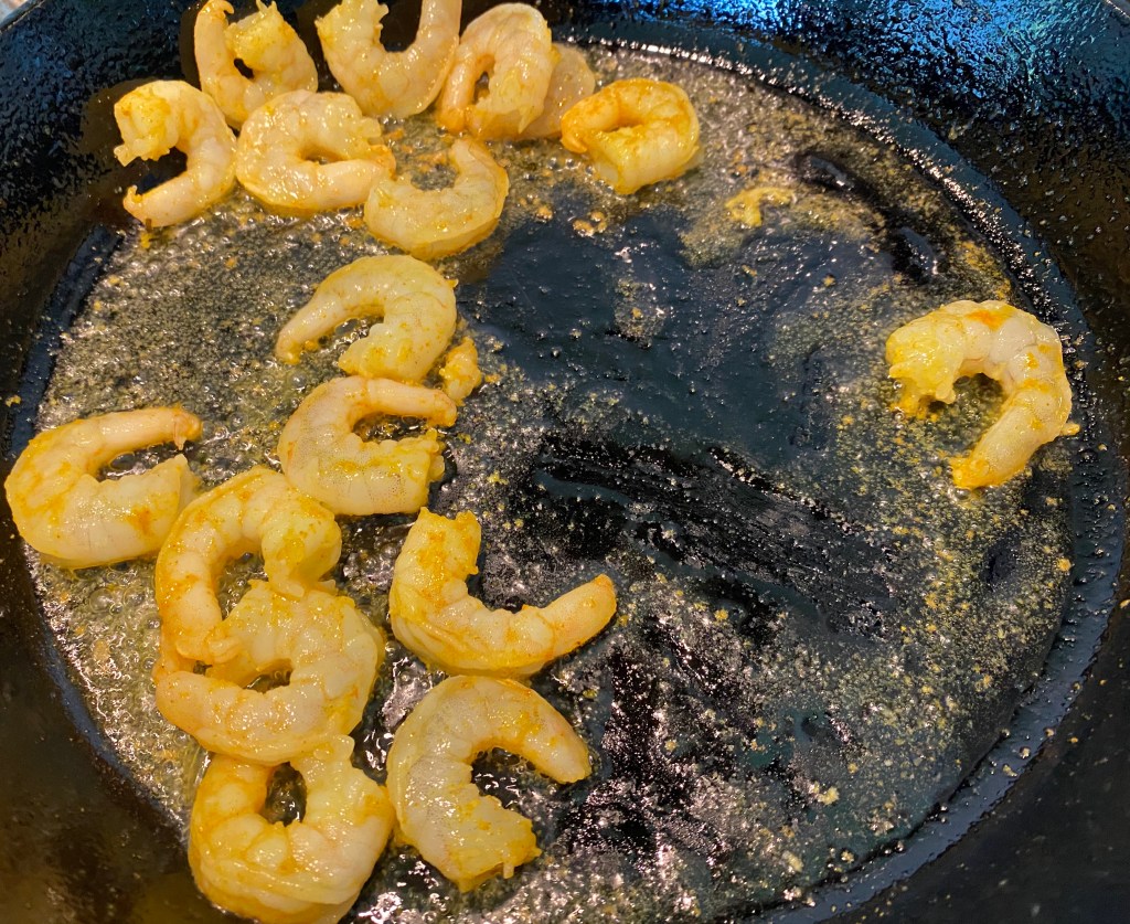 - Heat 1 tbsp oil. Sauté shrimp with salt and turmeric. Keep aside.
