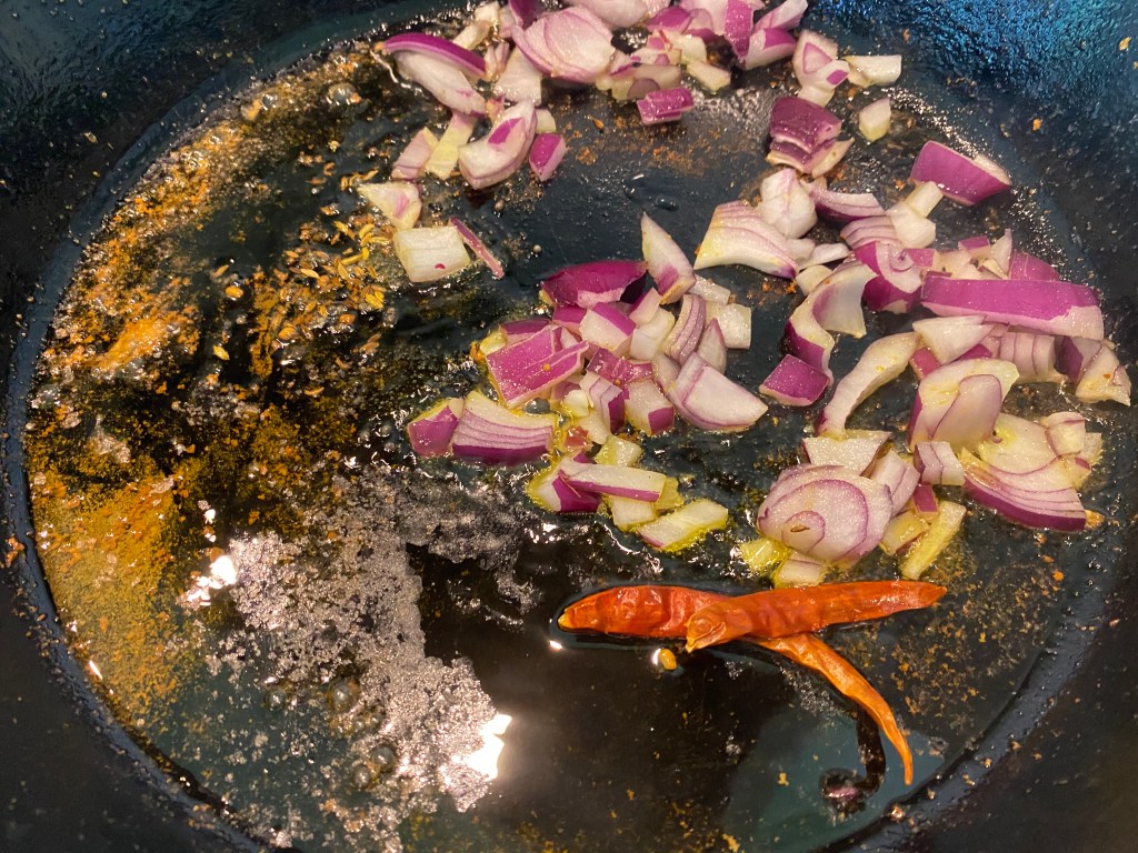 - Add in 2 tbsp into the pan. Add panch Phoron, asafetida and whole red chilies. Let it splutter and then add onions. Let the onions get translucent.