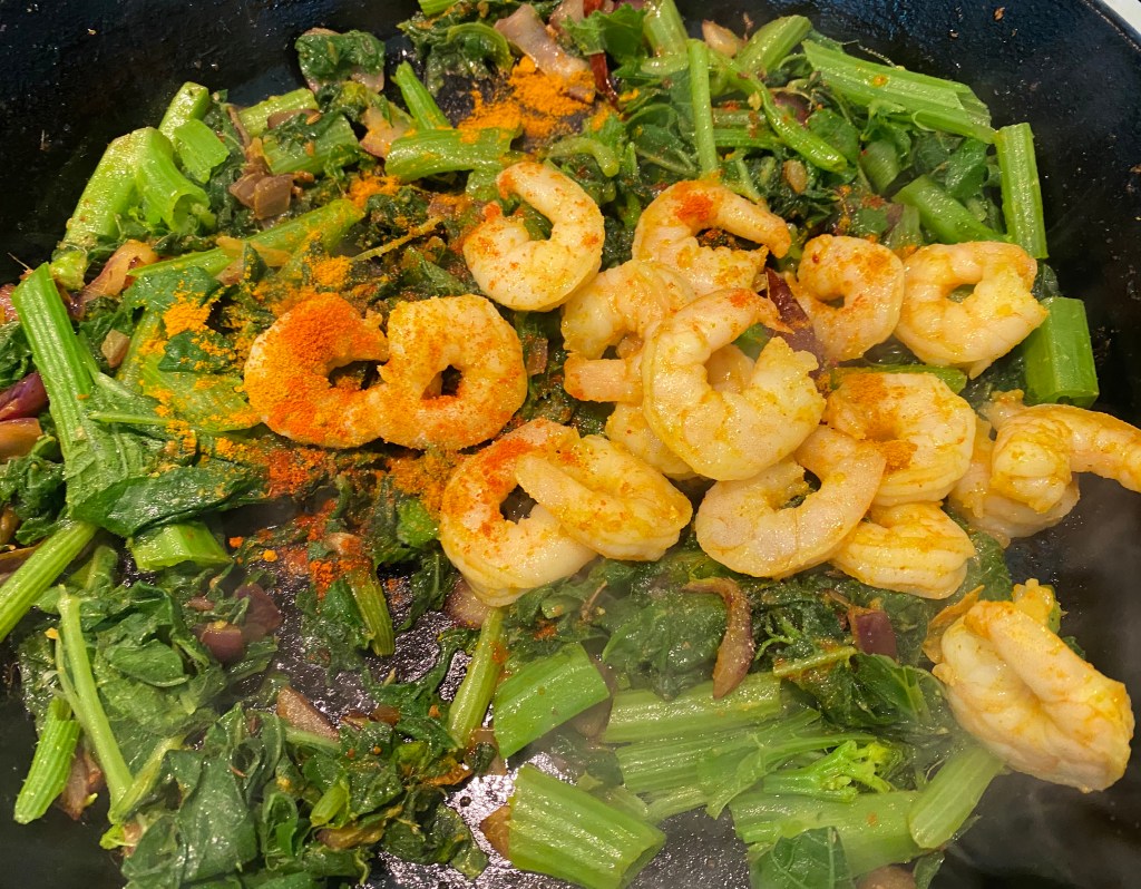 - Add the greens. Let it wilt on high heat. Add sautéd shrimp and coconut.