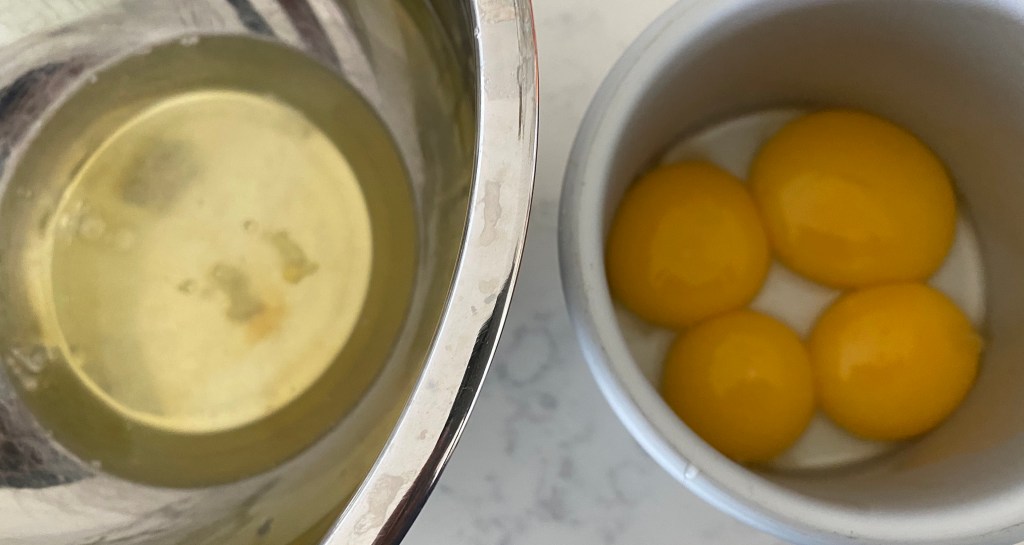 - Slowly mix in the egg white mixture and egg yolk mixture into the dry ingredients. Do not over mix. Just blend everything in.