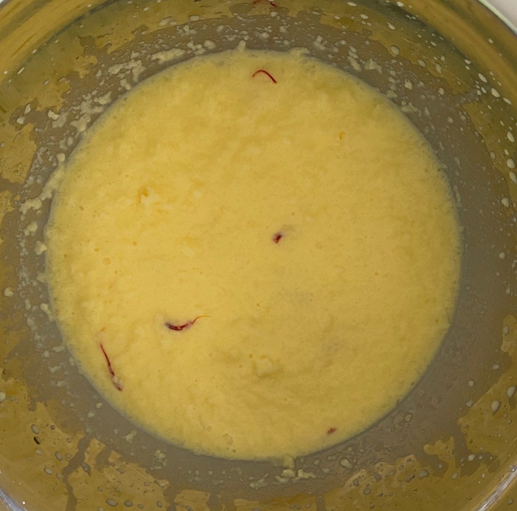 - In a small bowl beat together egg yolks, saffron water, rose water and milk.
