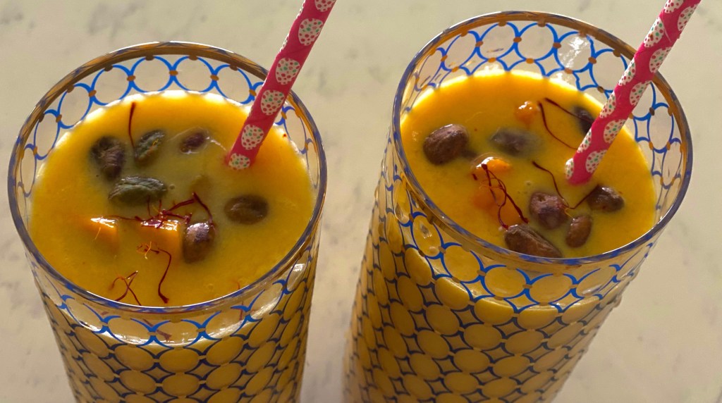 - Serve with a garnish of saffron threads, pistachios and mango chunks.