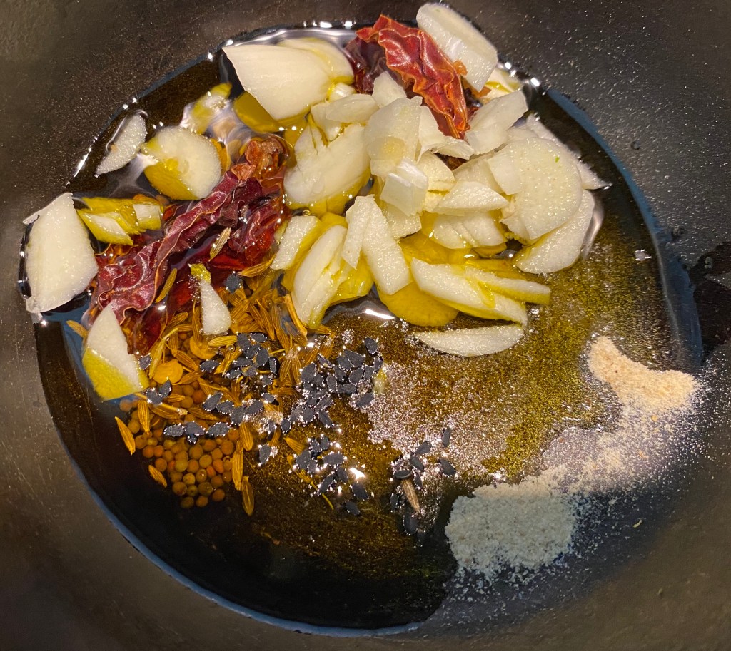 - In a small pan heat mustard oil. Temper nigella seeds, black mustard seeds, asafetida, red chilies, chopped garlic and cumin seeds. When they turn aromatic and start spluttering, add paprika and stir. Turn the heat off.