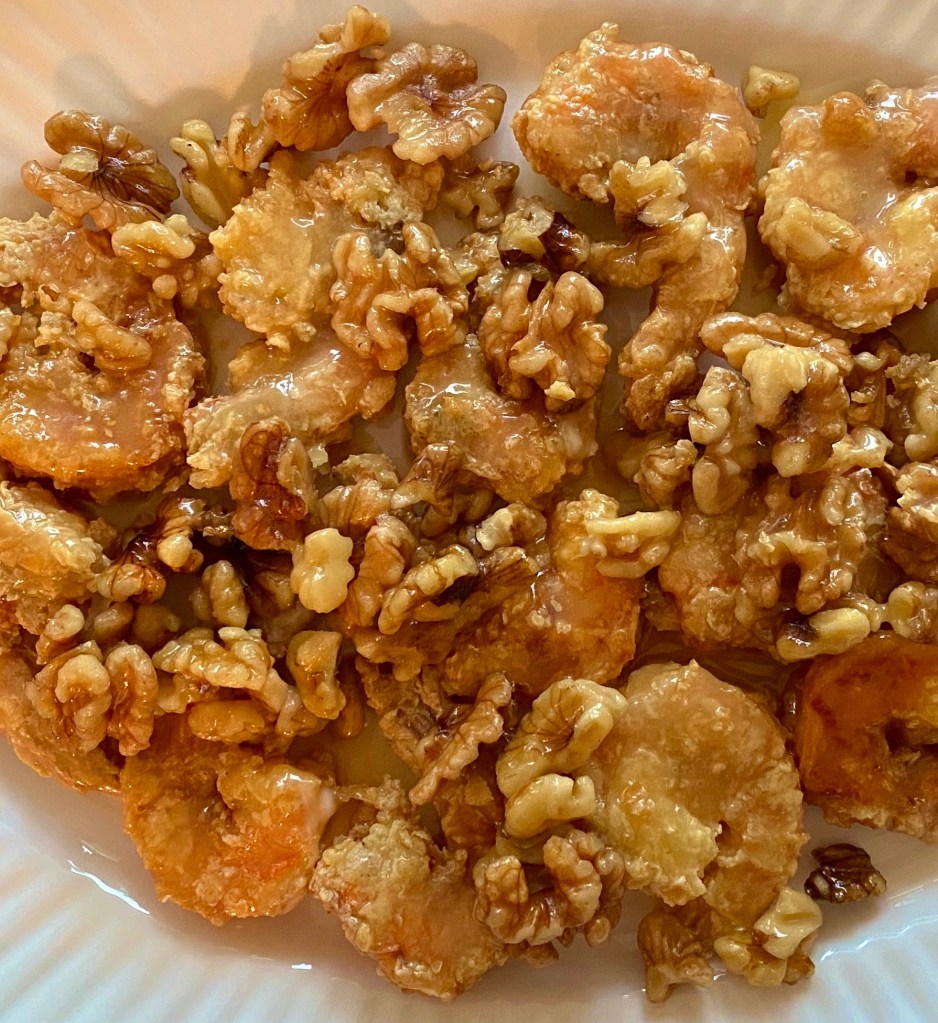 - In a large bowl combine mayonnaise, honey and cream. Mix shrimp into the sauce and coat. Top with candied walnuts.