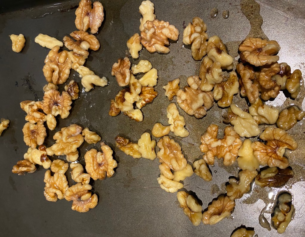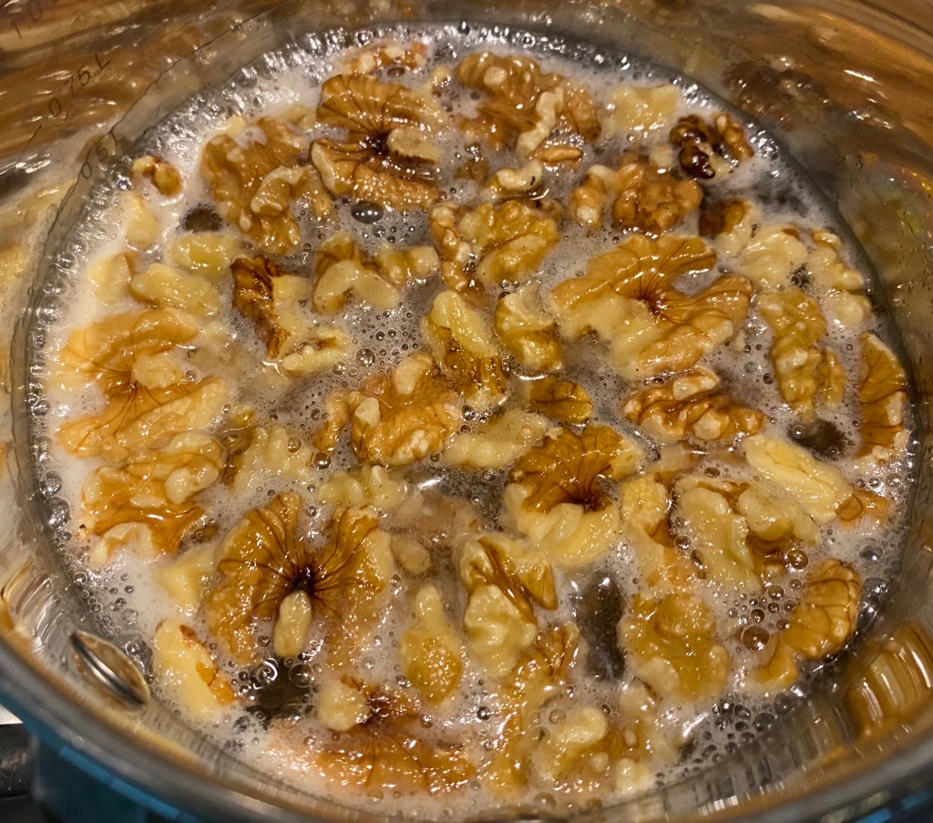 - Heat water and sugar. Let it come to a boil and thicken a bit to syrup consistency. Add walnuts. Simmer for 2 mins. Take the walnuts out and spread on a cookie sheet to dry.