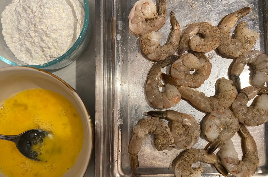 - Blot dry shrimp with kitchen towels. Season with salt and pepper. In a bowl beat eggs. In another bowl have the cornstarch ready. Dip each shrimp into beaten egg mixture and then into the cornstarch. Coat well.