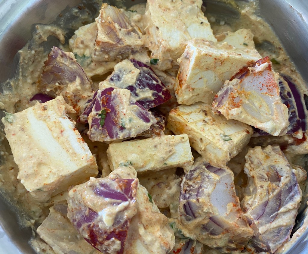 - Marinate paneer and red onions in yogurt mixture. Leave aside for at least an hour.