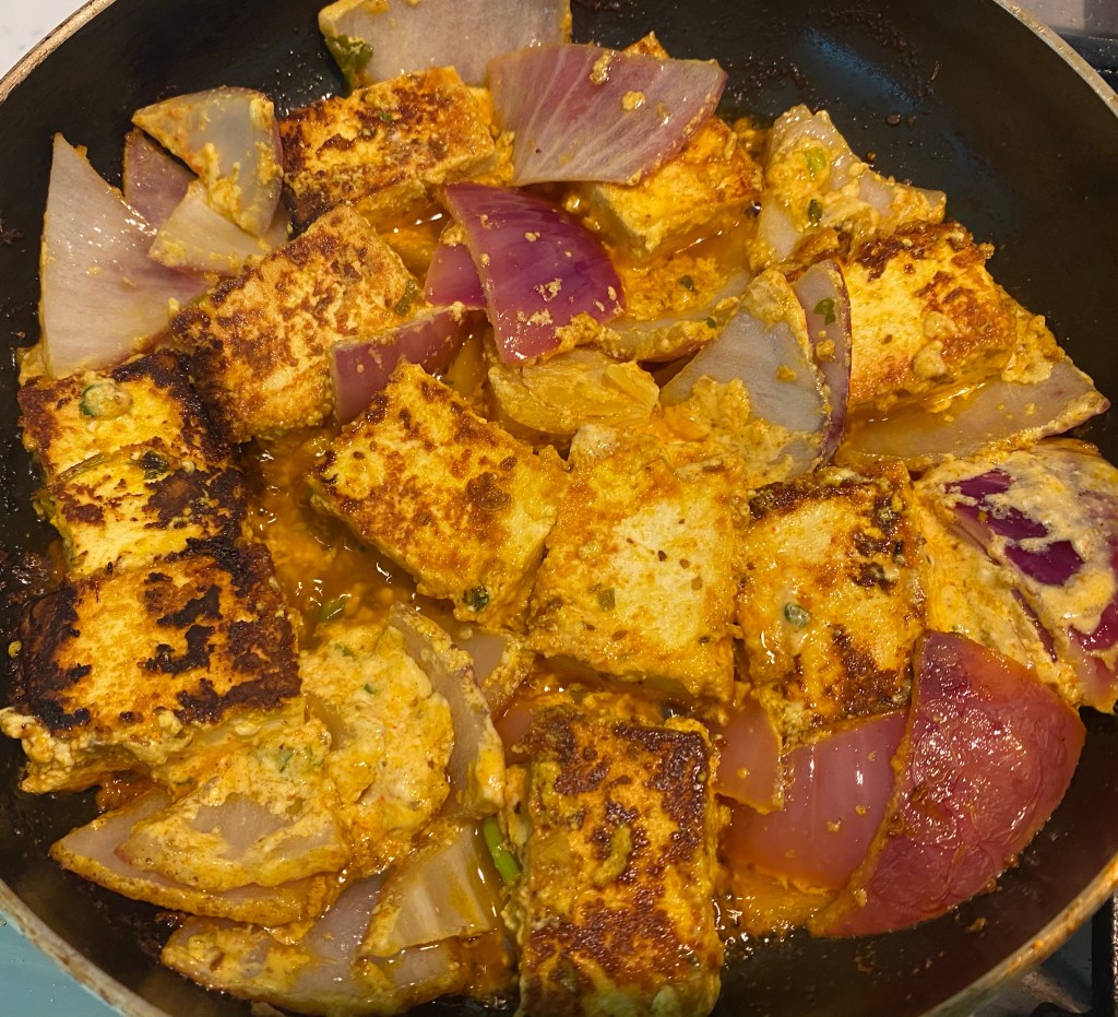- Sauté marinated paneer and onion on a medium flame along with the marinated mixture turning halfway till both sides are cooked.