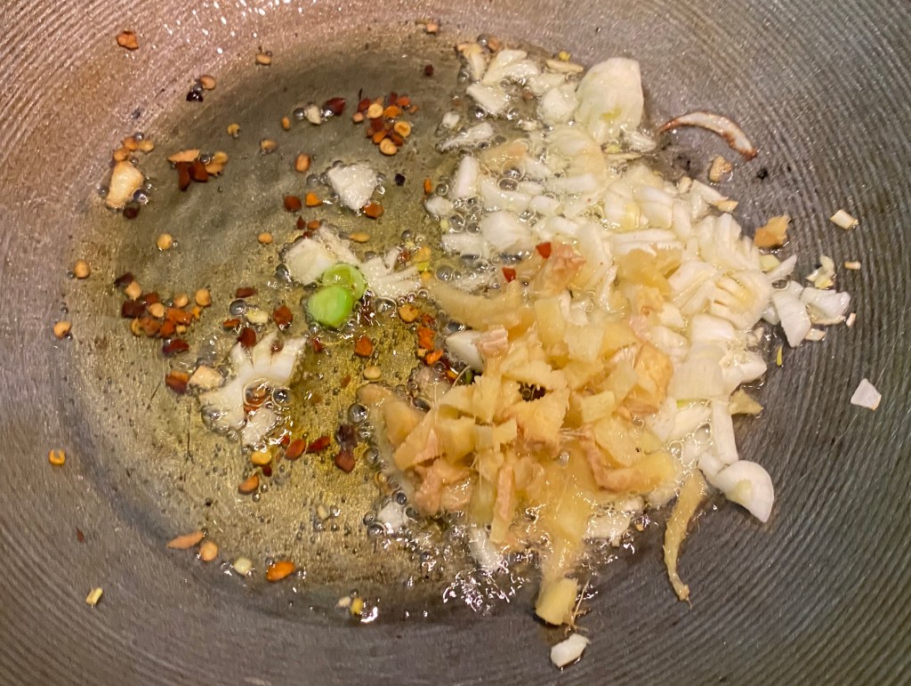 - Heat oil. Sauté garlic, ginger and red chili flakes for a couple of seconds. Add the vegetables. Sauté on high heat for a minute.