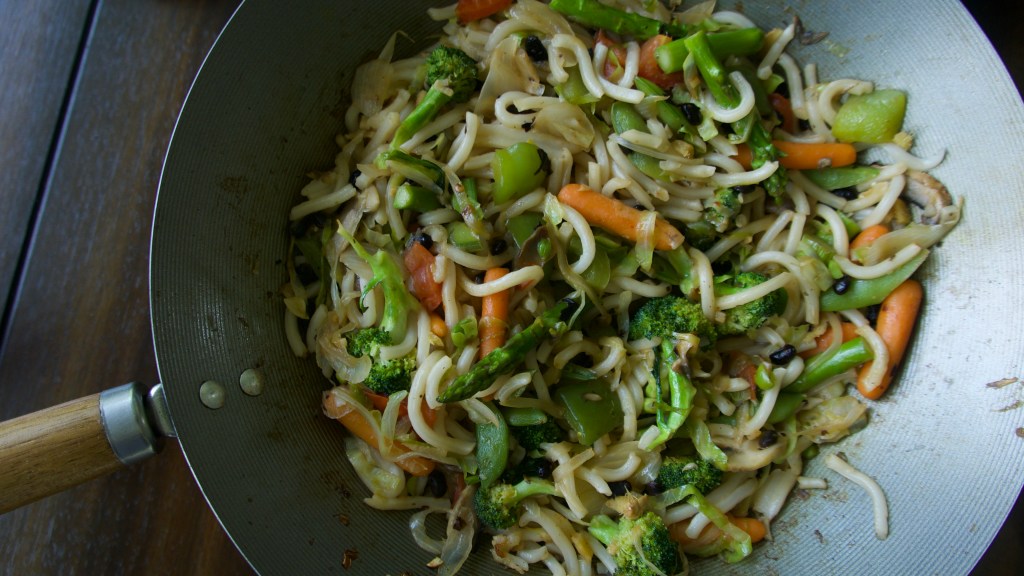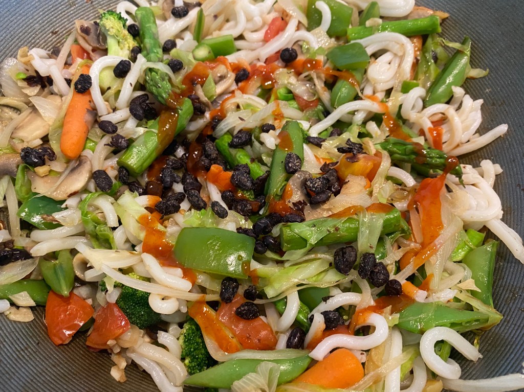- Add udon noodles, soaked fermented black beans, oyster sauce, sugar, sriracha and black pepper. Stir fry everything stirring occasionally till the sauce is coated on the noodles. Serve immediately.
