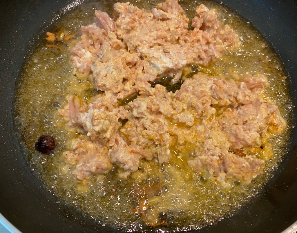 - Add in marinated chicken mince. Keep the heat on high and fry the meat till it starts melting into the oil. Add chopped tomato. When the tomato starts to integrate into the sauce add tomato paste. Let it cook for a couple of minutes.