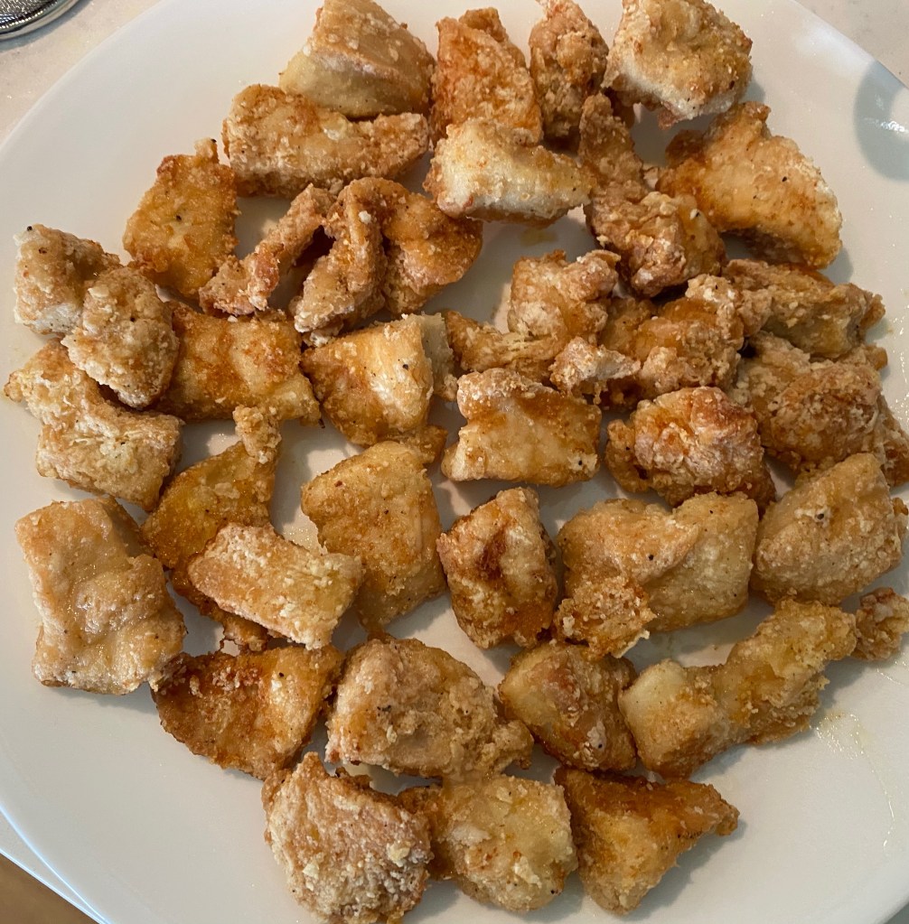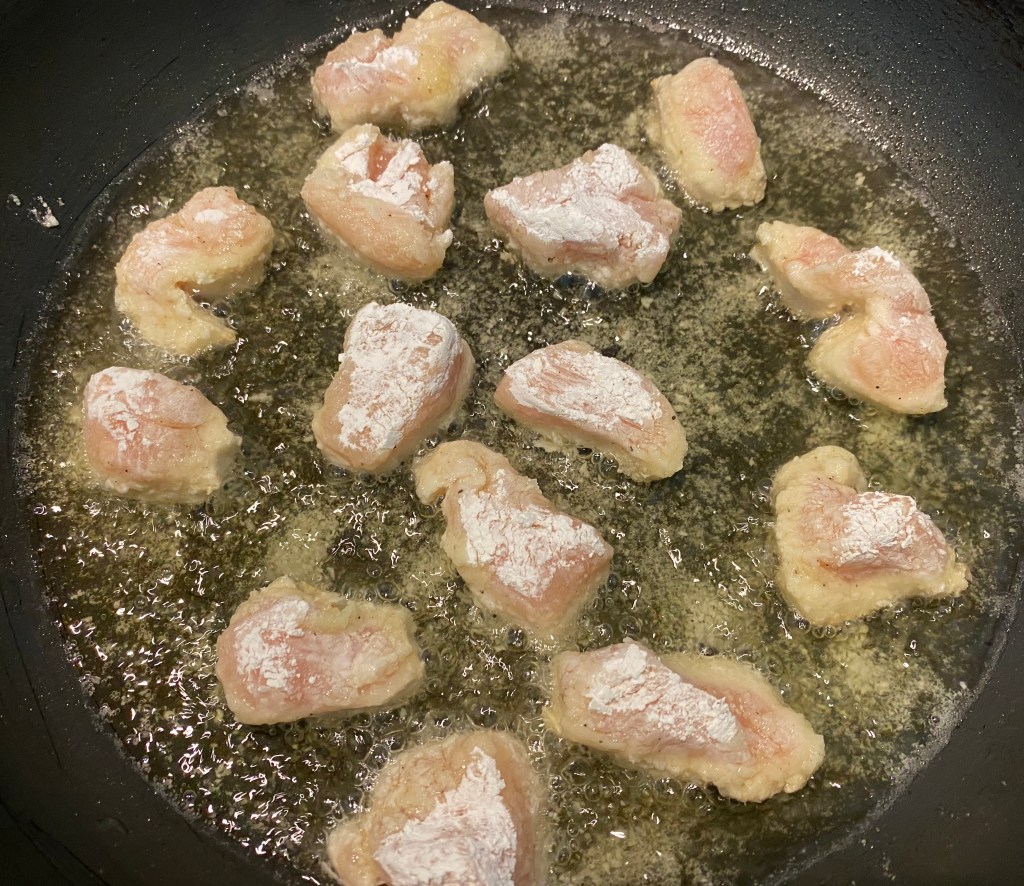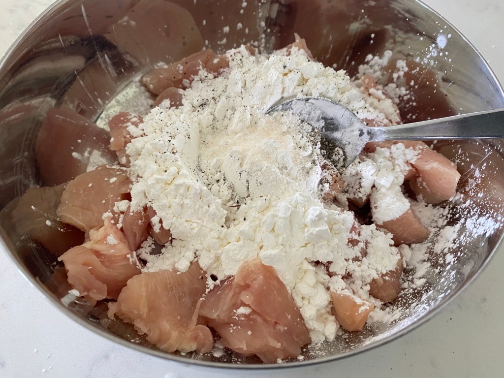 - Cut boneless chicken into small 1 inch pieces. Put in bowl. Add in ½ cup of cornstarch, 2 tsp salt and black pepper. Toss to combine and dredge the chicken with the cornstarch.