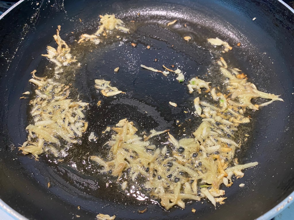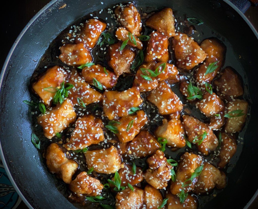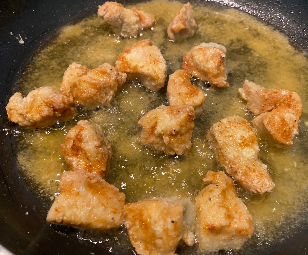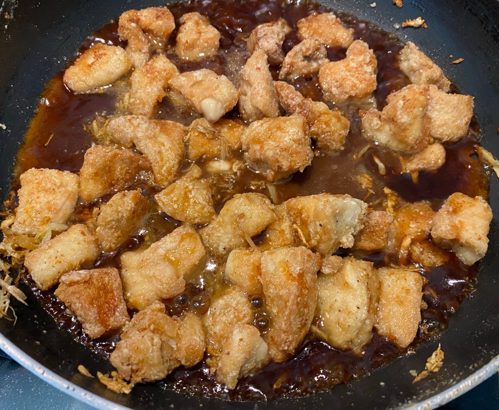 - Heat 1 tbsp of sesame oil. Sauté grated ginger and garlic. Add the fried chicken. Toss together to combine. Add the sauce and let it come to a boil and thicken up. Turn the heat off.