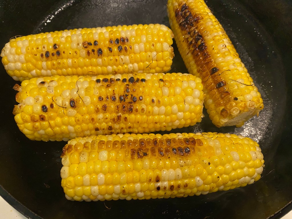 - Heat mustard oil in a cast iron pan. Put the corn cobs in the pan.