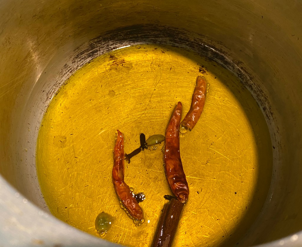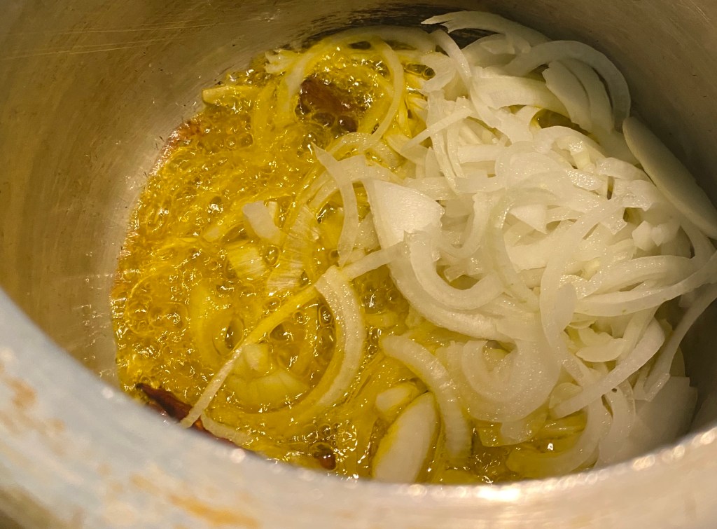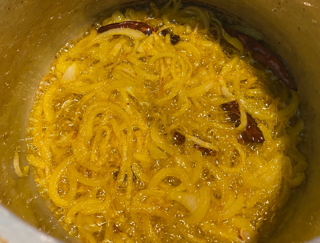 - Heat mustard oil till it starts to smoke. Cool it down. Heat the oil again. Temper the oil with whole red chilies, green cardamom, cloves and cinnamon. Let it splutter. Add sliced onions. Keep the flame at medium and cook those onions till they caramelize.