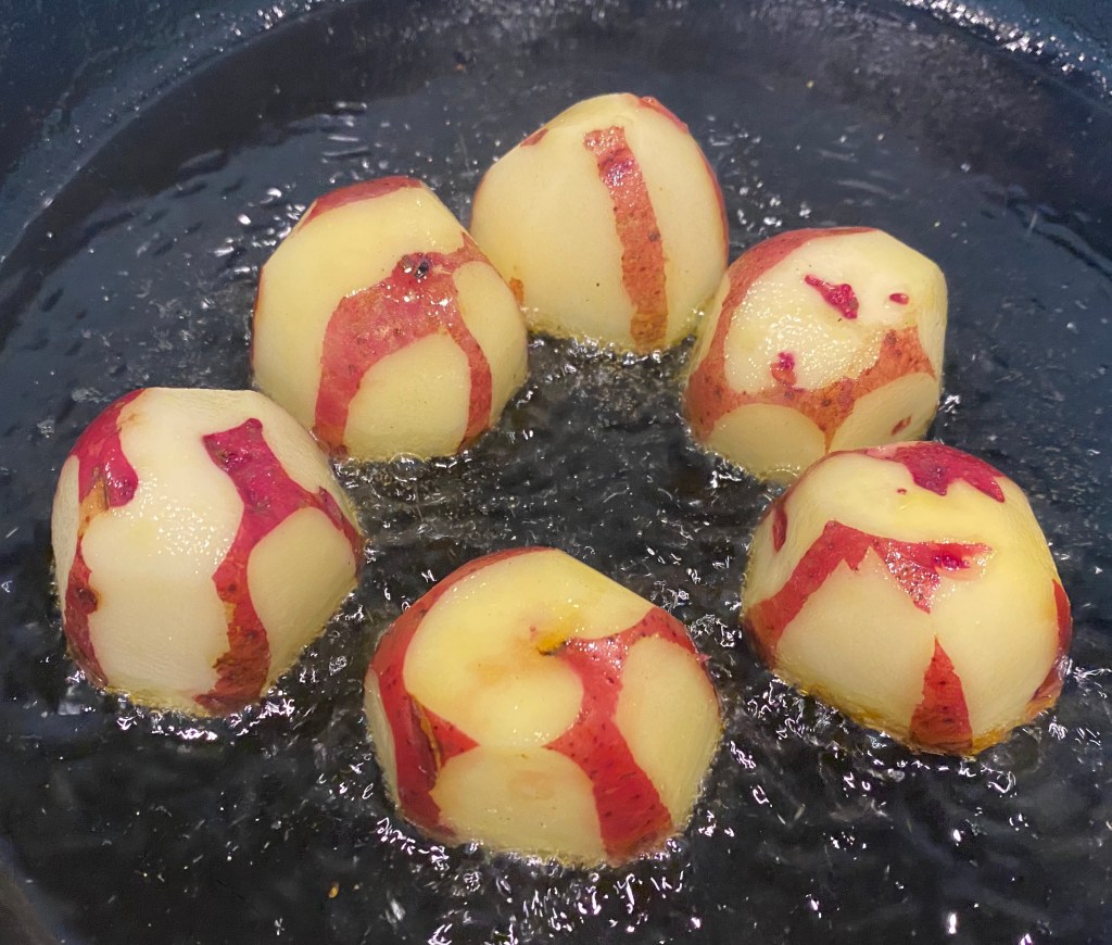 - Add in the marinated meat. Turn the heat up. Fry the meat. While the meat is frying, heat up 1 tbsp of oil in another pan. Pan fry the potatoes with salt and turmeric till golden. Keep aside.
