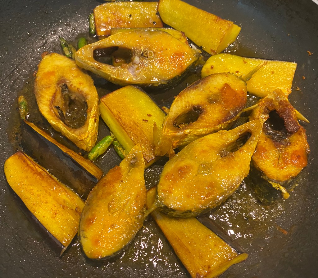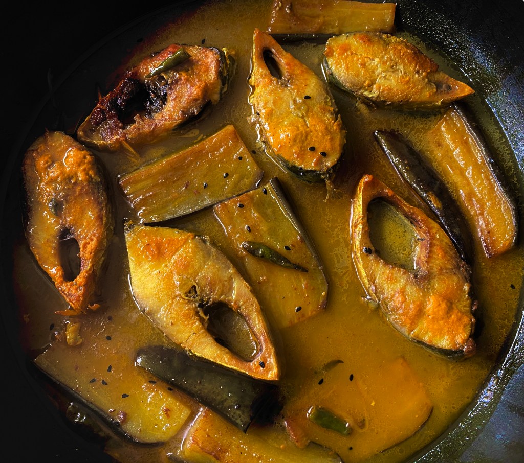 Ilish or hilsa ( Tenualosa ilisha, shad), a kind of Indian herring is a freshwater fish. It is found in eleven countries around the world including Bangladesh, Pakistan and Myanmar. Ilish is the queen of all fish. For a Bengali it is love and passion. Ilish Bhaja (fried Hilsa pieces), Doi Ilish (Hilsa in a a yogurt based sauce), Ilisher Paturi (steamed Hilsa in a spicy mustard sauce), Ilisher Jhal (Hilsa in a Spicy Gravy), Ilish Machher Tel Jhol (Hilsa curry made with eggplants and nigella seeds ), Bhapa Ilish (Steamed Hilsa), Shorshe Ilish (Hilsa in a black mustard sauce)- the choices are endless. This is a very simple recipe with the taste coming from the fish itself combined with the flavor of the nigella seeds @sarchakra