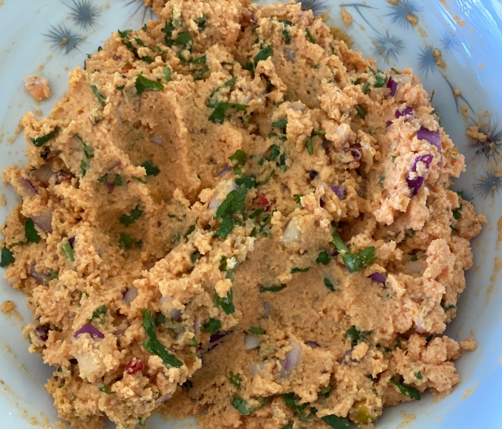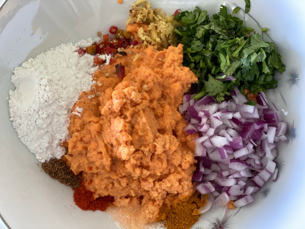 - Add to it the rest of the red chili powder, grated ginger, sugar, 1 tsp cumin seeds, finely chopped onion and chopped coriander. Mix everything together.