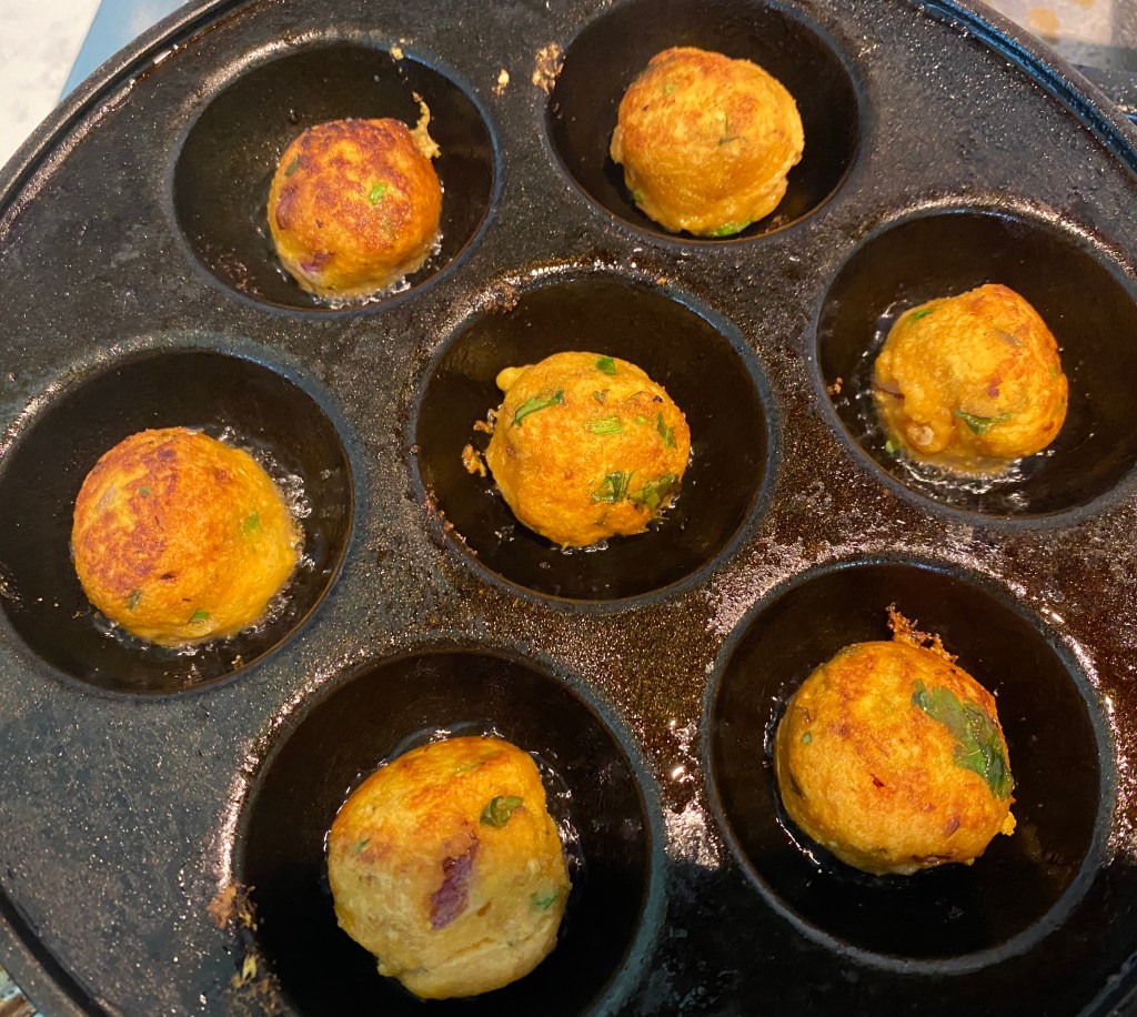 - Heat the appam pan. Put 1 tsp of oil in the center of each slot. Make small balls out of the mixture and put in the slots. Turn halfway through to make sure all sides are fried golden. Drain on kitchen towels. Repeat for the rest of the batter.