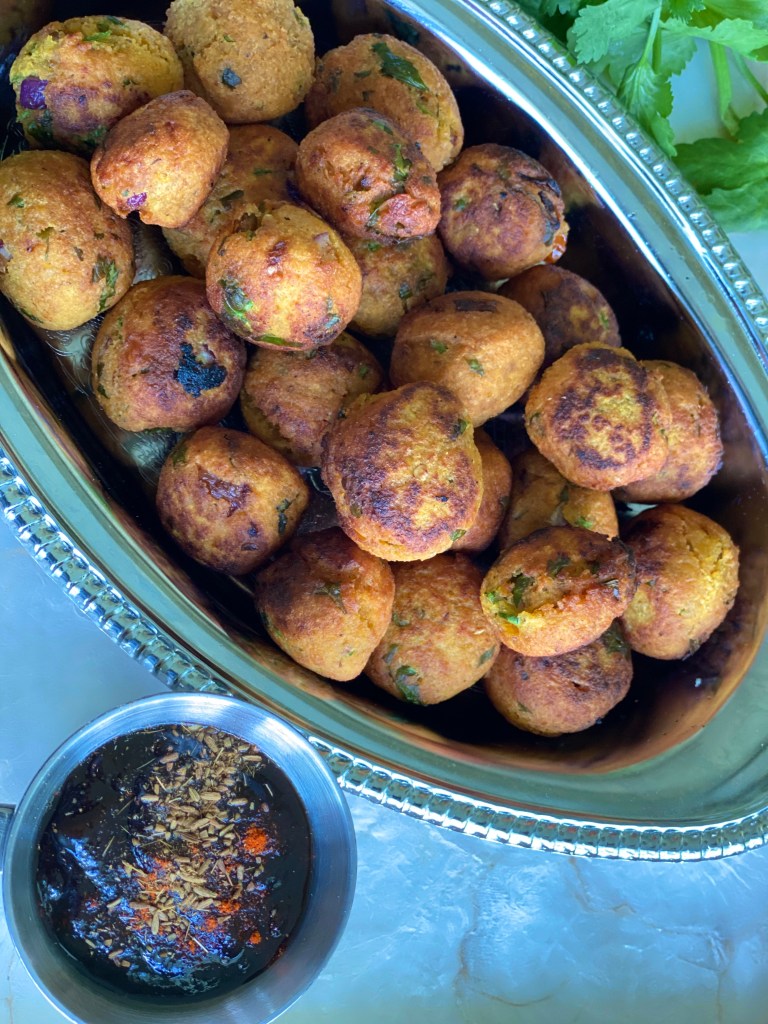 Soaked red lentils made into crunchy fritters is delicious just on its own or with the tamarind sauce. You can fry the pakoras instead of using the ebelskiver or appam pan. Using the appam pan is definitely healthier as very little oil is needed without compromising the taste. Any leftovers make great veggie wraps with some salad greens or smash them as a sandwich filling. The choice is yours @sarchakra