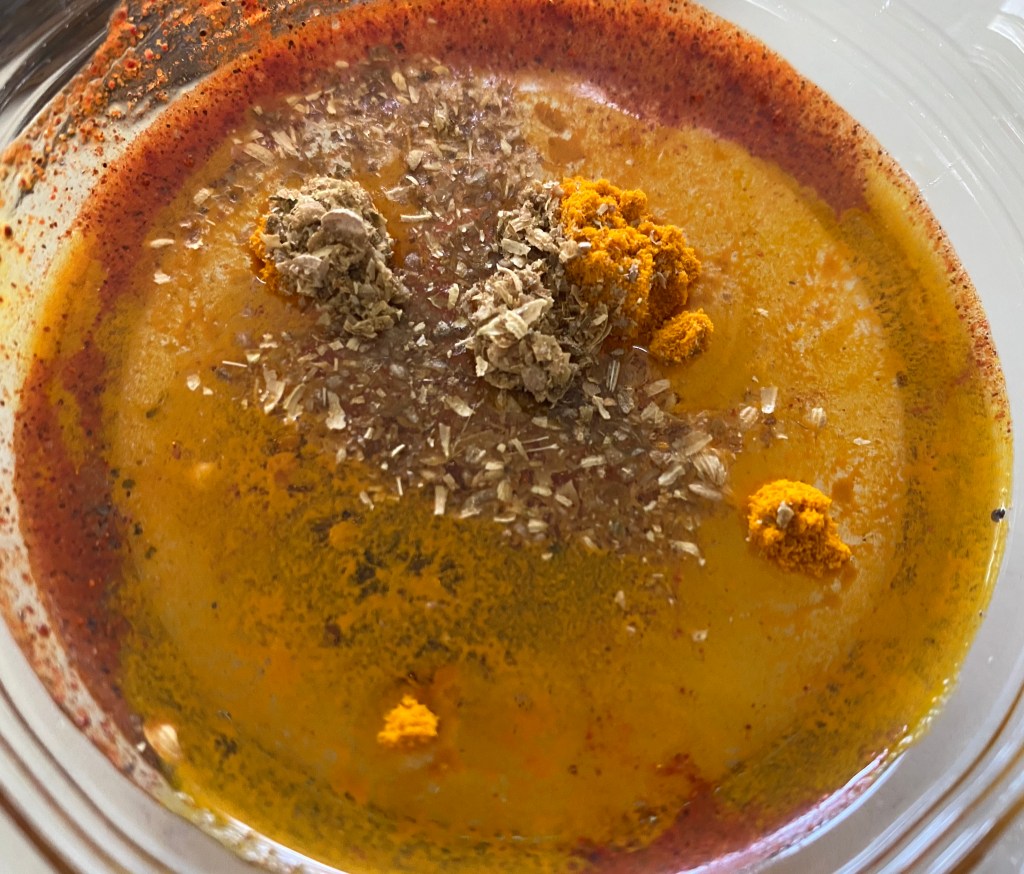 - In a small bowl mix together olive oil, salt, turmeric, crushed coriander and paprika.