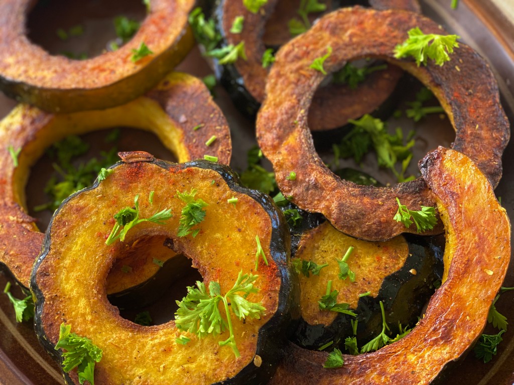 - Put acorn squash rings on a serving tray. Top with freshly chopped parsley. Pour any leftover olive oil mixture. Serve.