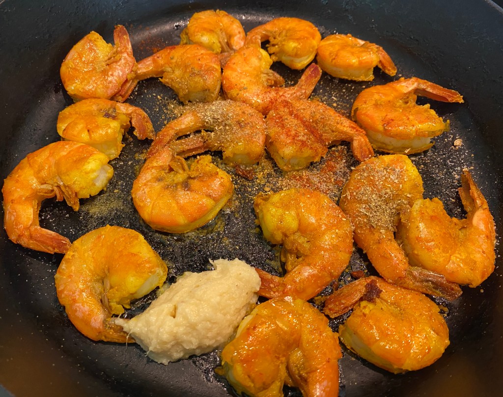 - Heat oil. Sauté shrimp on high heat till pink on both sides.