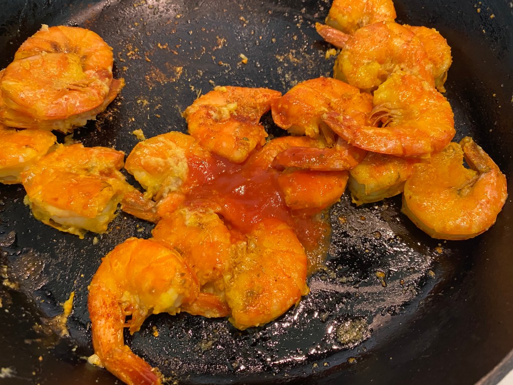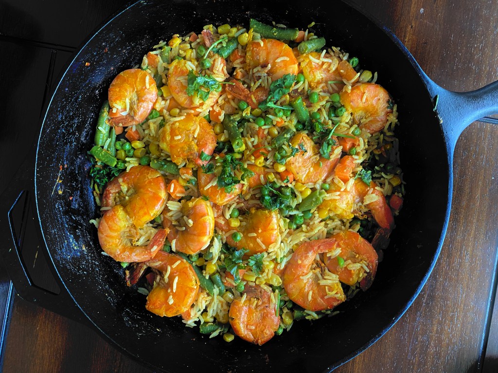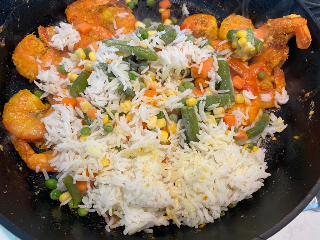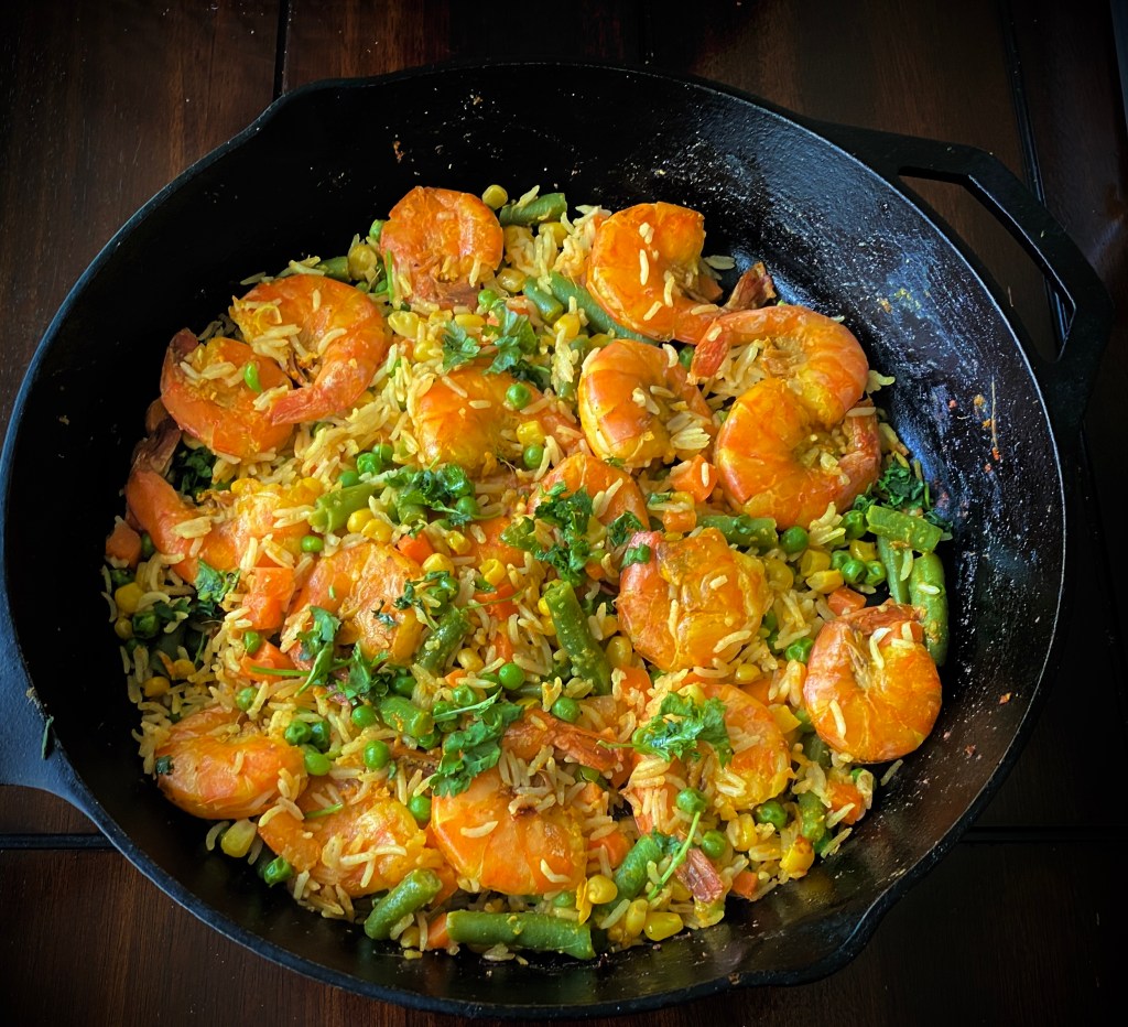 One pot meals are especially convenient for weekdays but why not weekends too? Everything is done in the cast iron pan so it’s easy peasy cleanup and everyone is happy. The entire recipe is done within 10 mins so gather everything before you start. My son loves shrimp so I went heavy on the proportion of rice to shrimp. Fell free to use as many as you are personally comfortable with @sarchakra