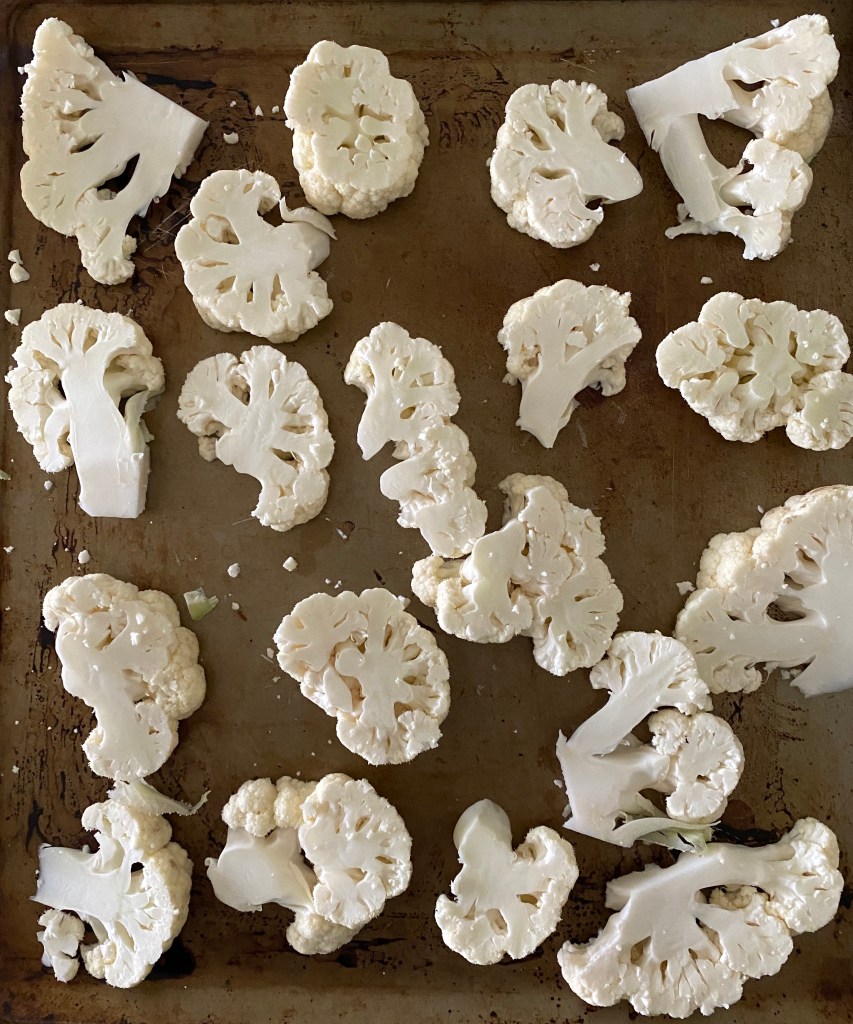 - Brush the cauliflower steaks with the olive oil mixture on both sides.
