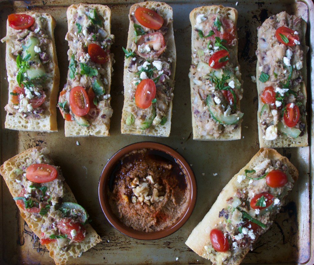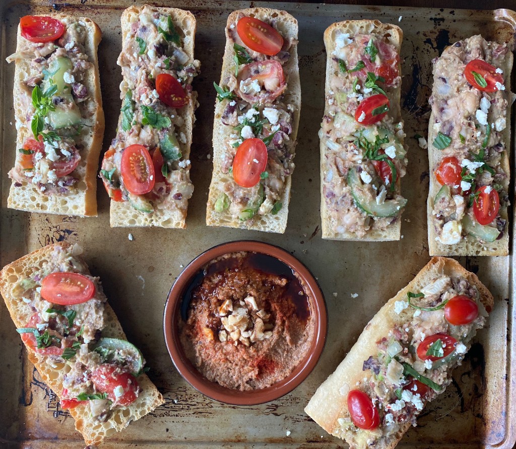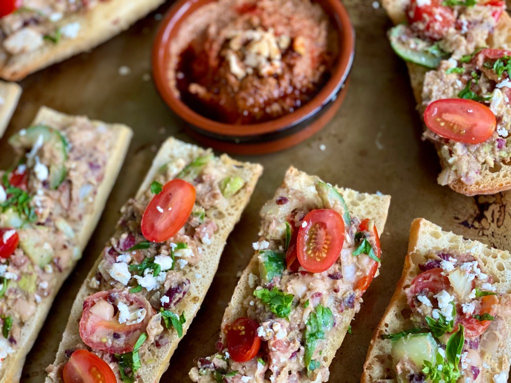 - Top the toasted baguette with the mashed beans mixture. Garnish with halved cherry tomatoes, mint, basil and crumbled feta cheese.