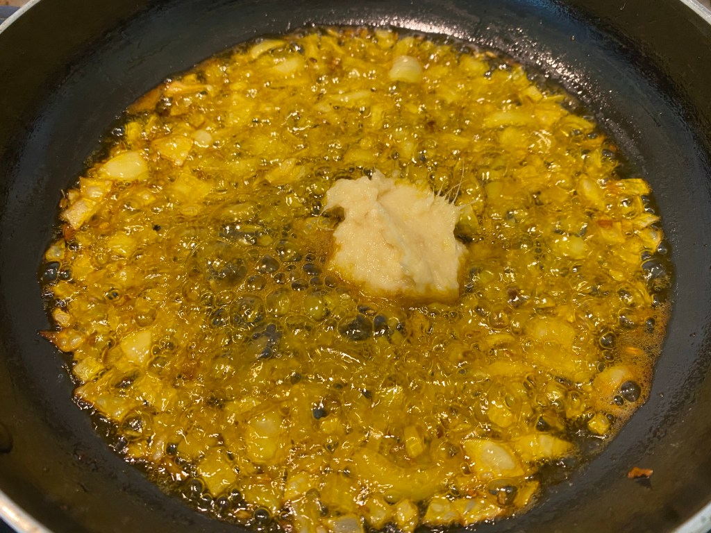 - Temper the oil with cumin seeds. Let it splutter. Add in chopped onion. Cook till onion is golden. Add in ginger and garlic paste. Sauté for a few seconds.