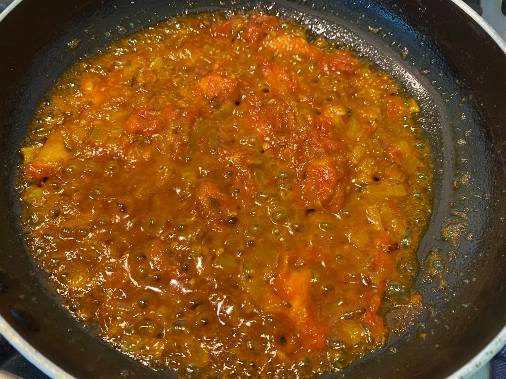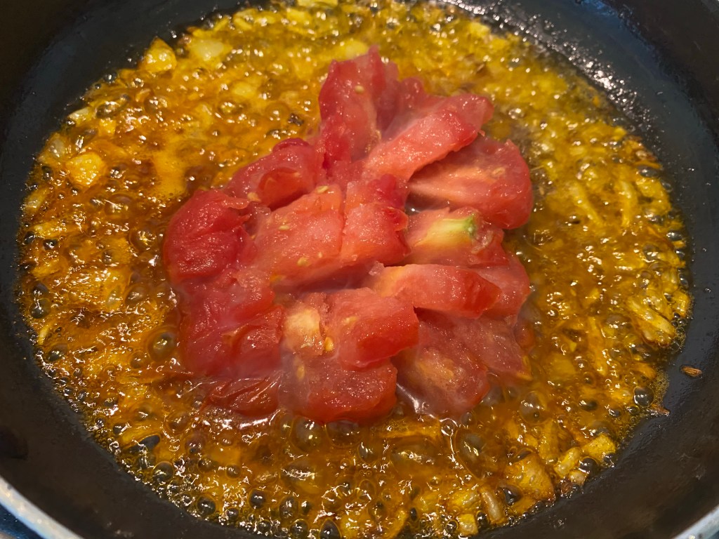 - Add in turmeric, red chili powder, cumin powder and coriander powder. Stir for a few seconds. Then add in chopped tomato. Let the tomato cook into the oil till the oil starts leaving the sides of the pan.