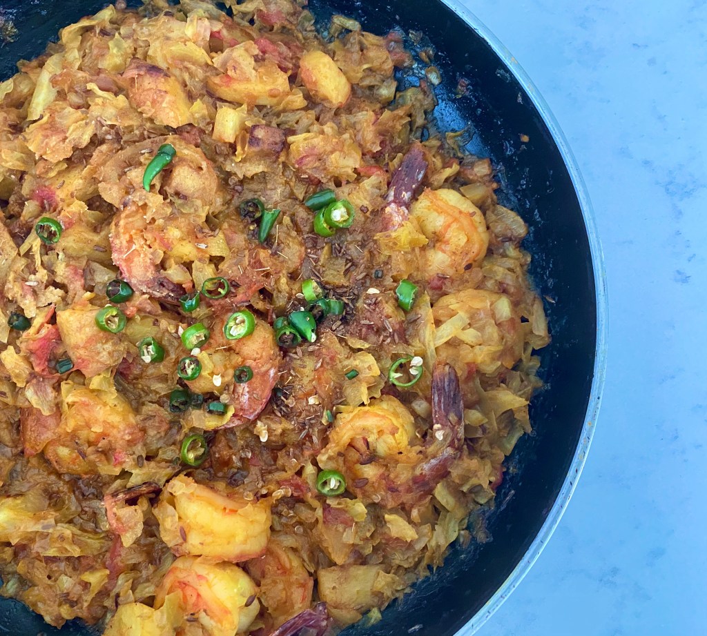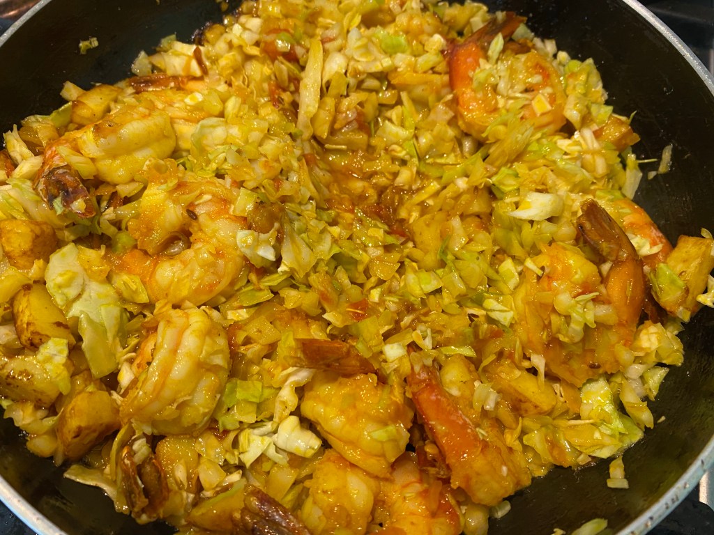 - Add the sautéd potatoes, chopped cabbage and shrimp. Season with salt. Turn the heat down to a low simmer. Cover and cook till the cabbage and potatoes are done. This should take about 15-20 mins. There is no need to add any water as the cabbage will release moisture while it cooks.