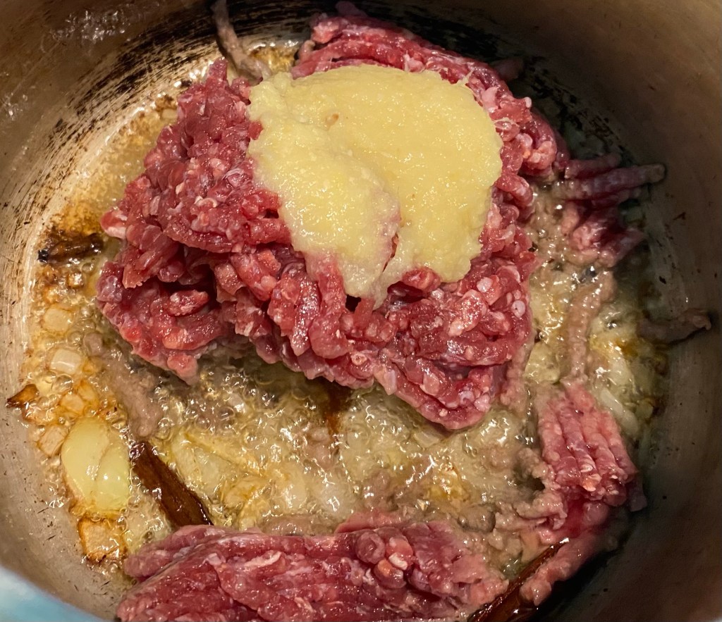 - Mix in goat mince. Add ginger and garlic paste. Sauté the meat for a couple of minutes.